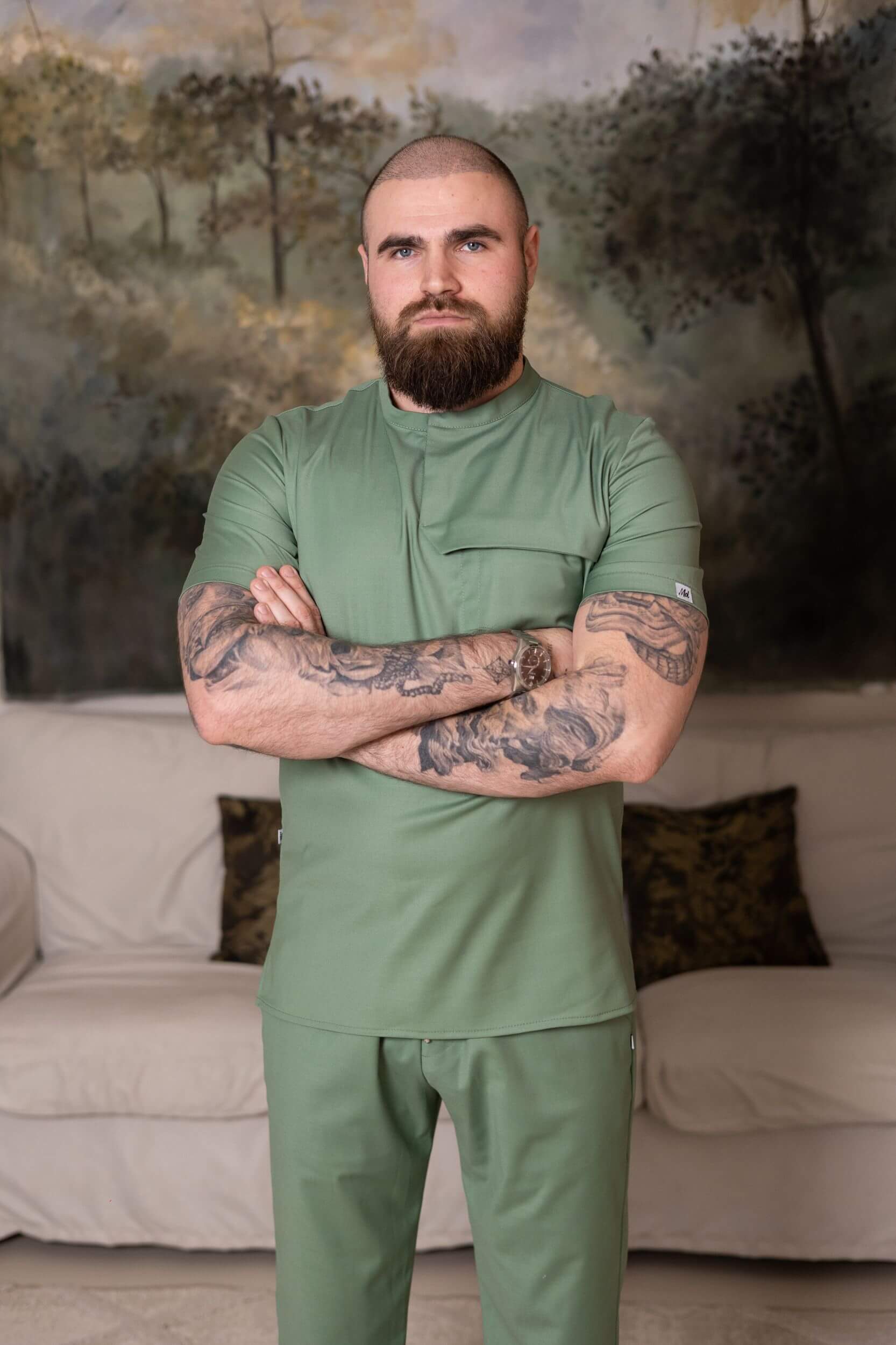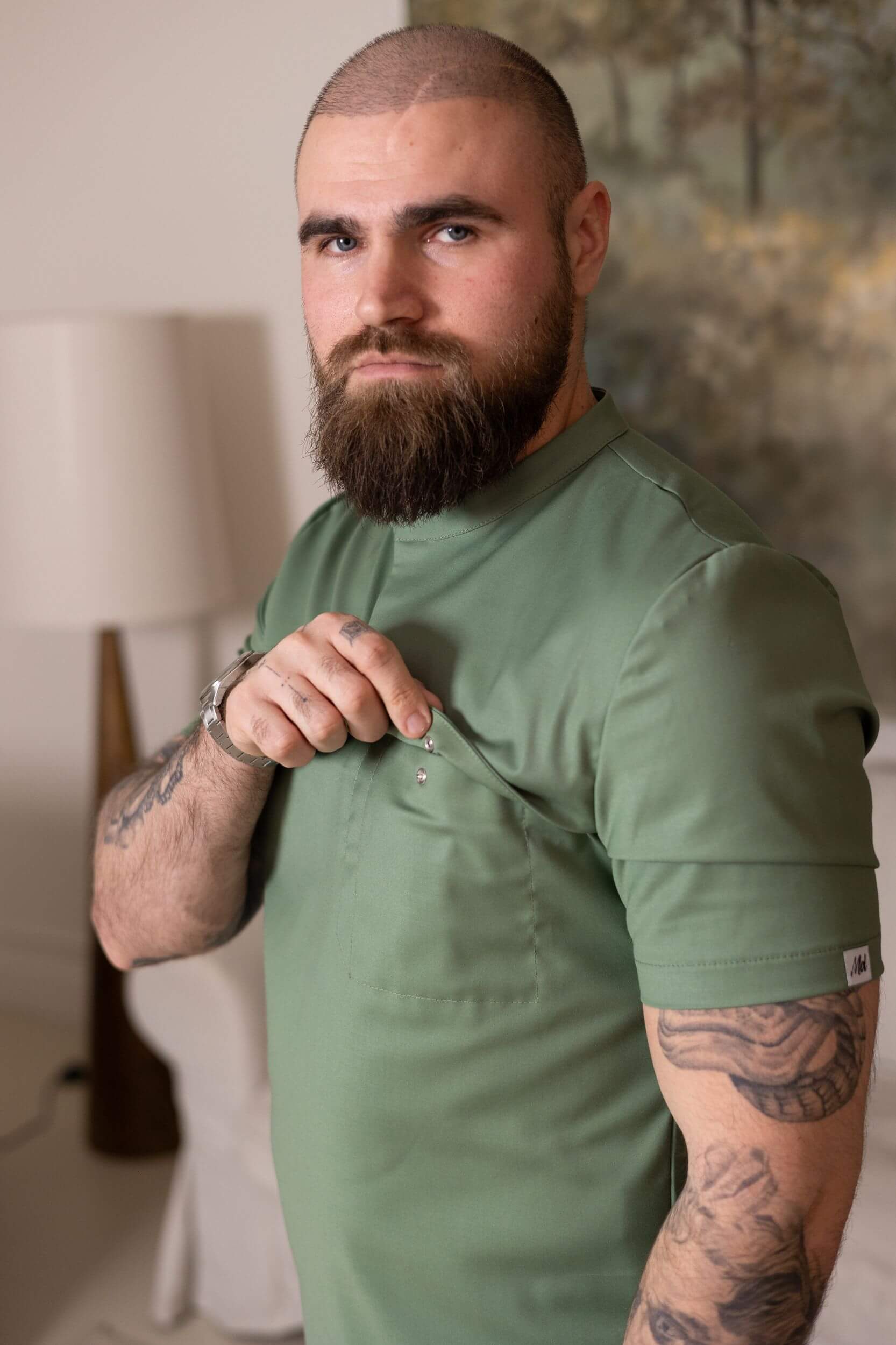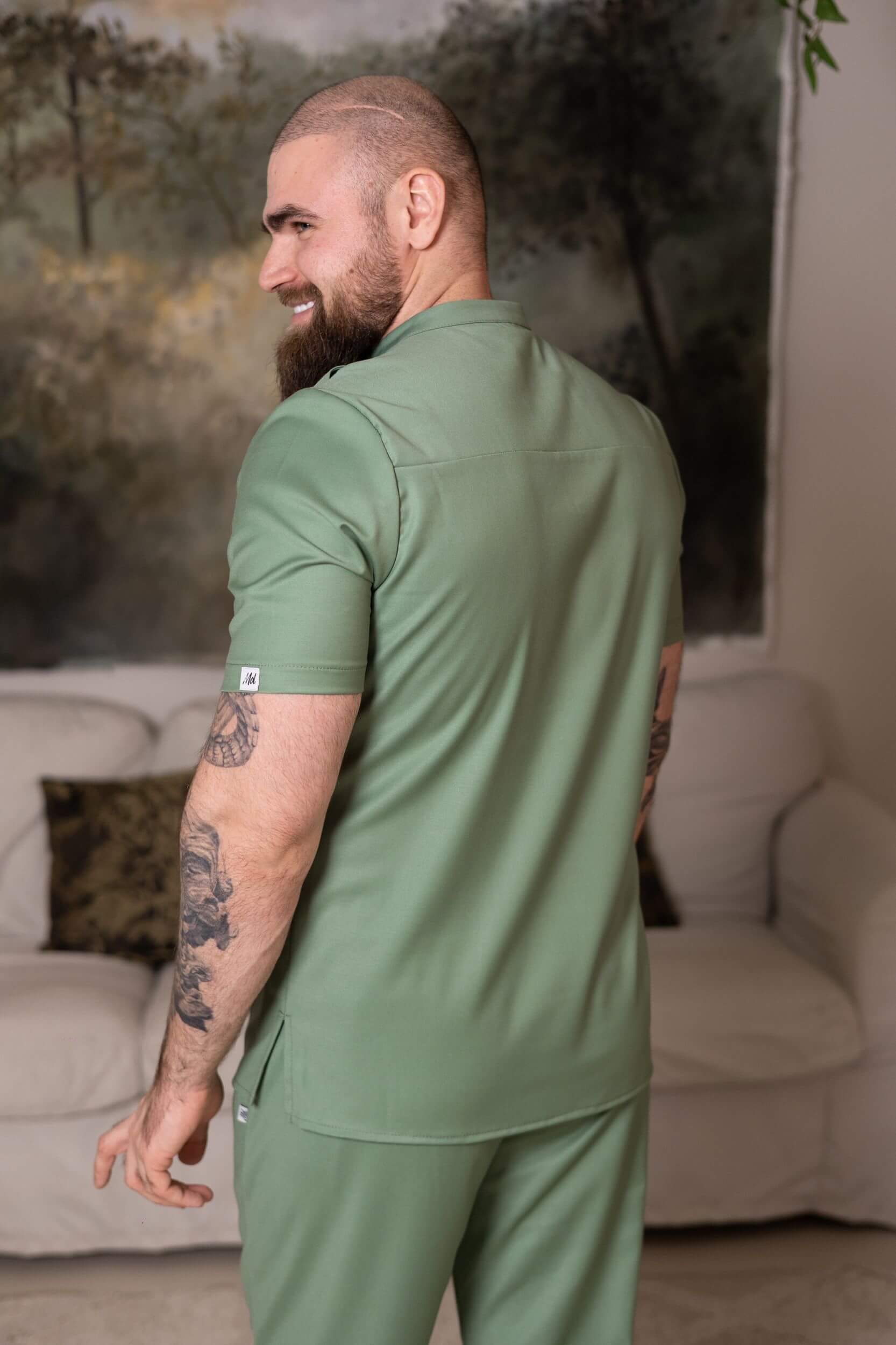 Фисташковый цвет выглядит свежо и профессионально, легко сочетается с медицинскими брюками и придаёт образу спокойный, современный характер.