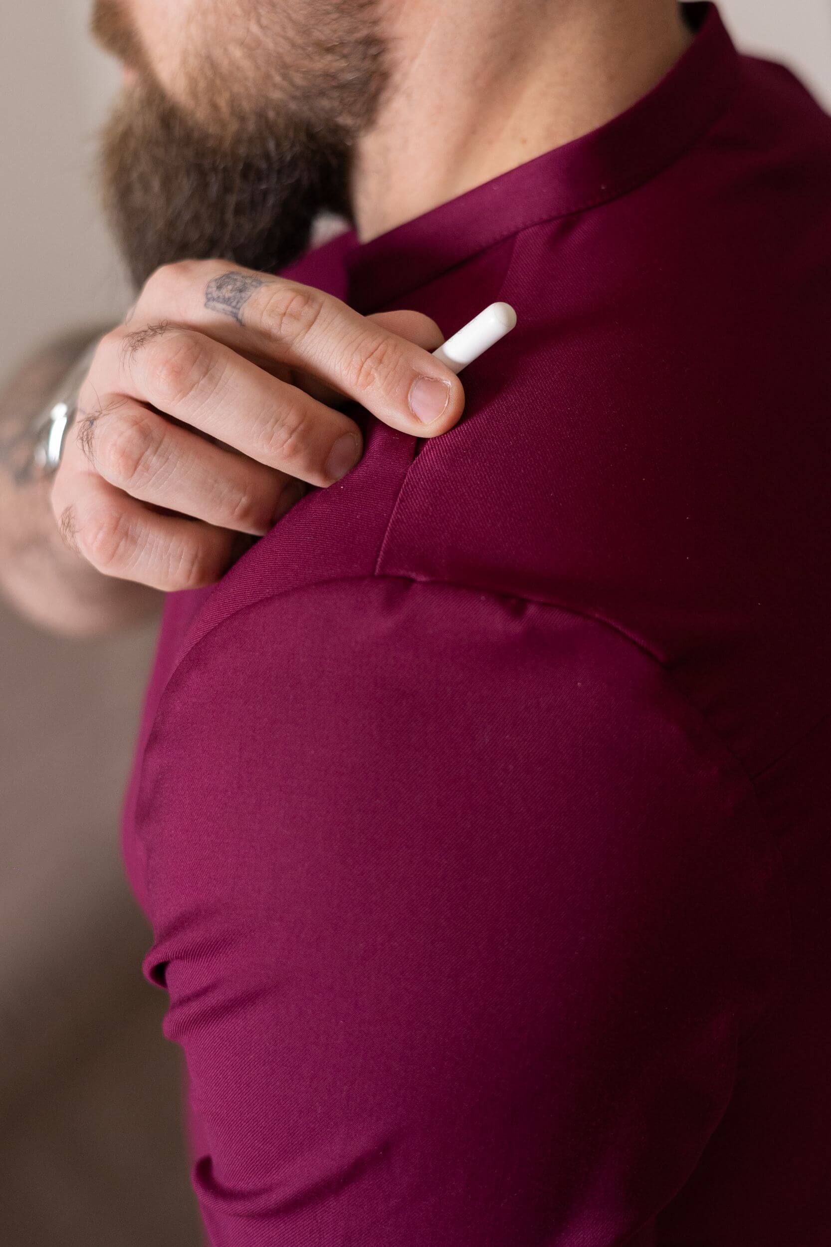 Спереди слева расположен практичный нагрудный карман, а фирменная особенность всех моделей Гроссо — дополнительный кармашек во шве на плече для ручек и мелочей. Мягкий, износостойкий материал хорошо держит форму, легко стирается и сохраняет насыщенный цвет даже при частом использовании. Винный оттенок добавляет образу глубины и профессиональной выразительности.