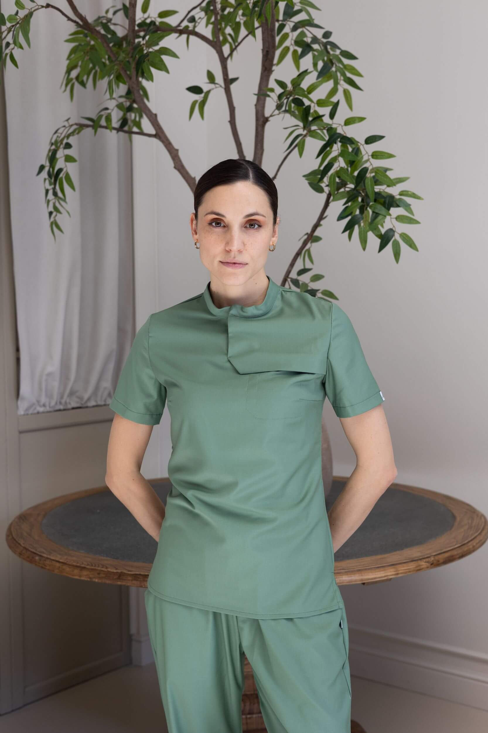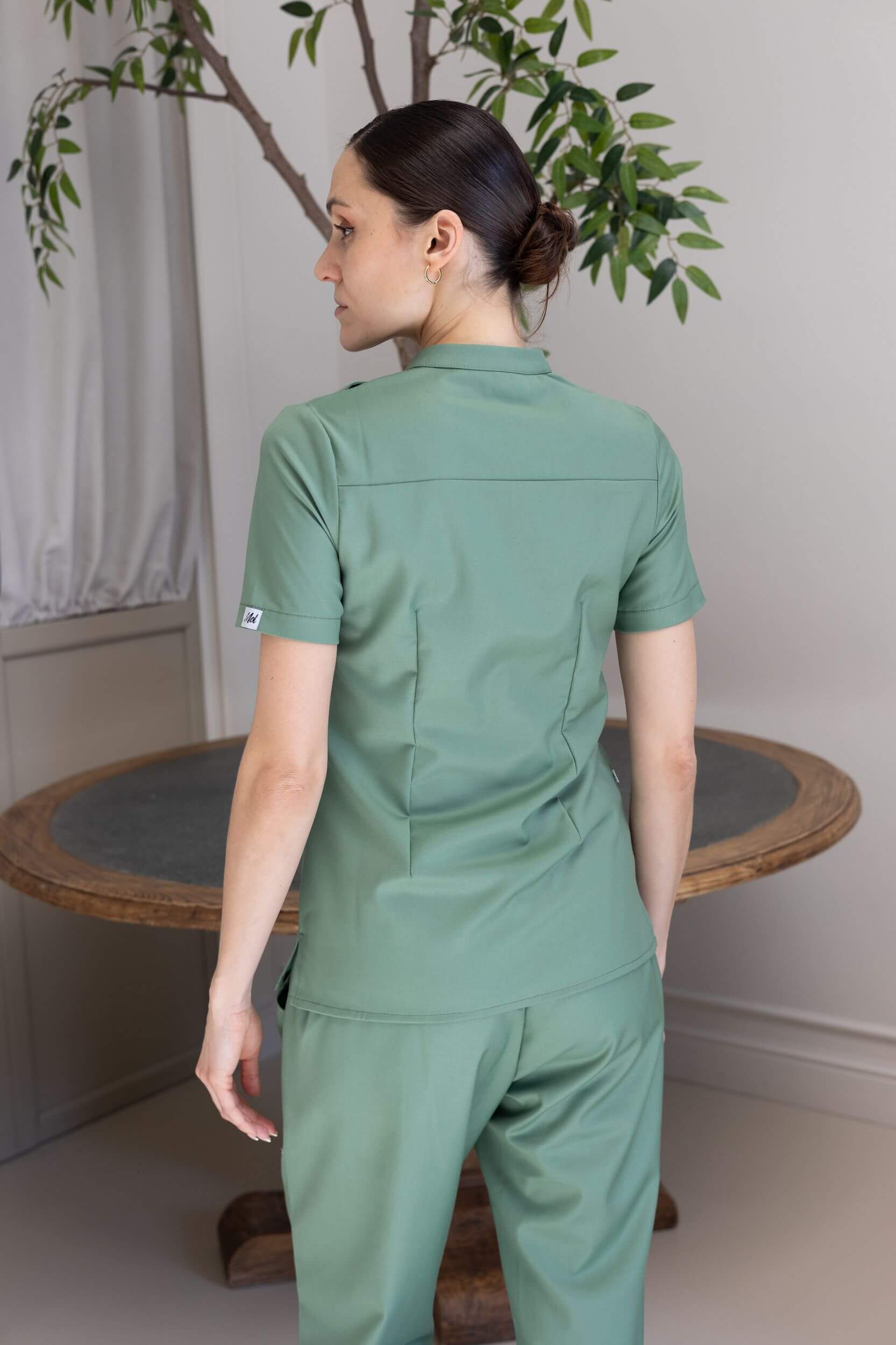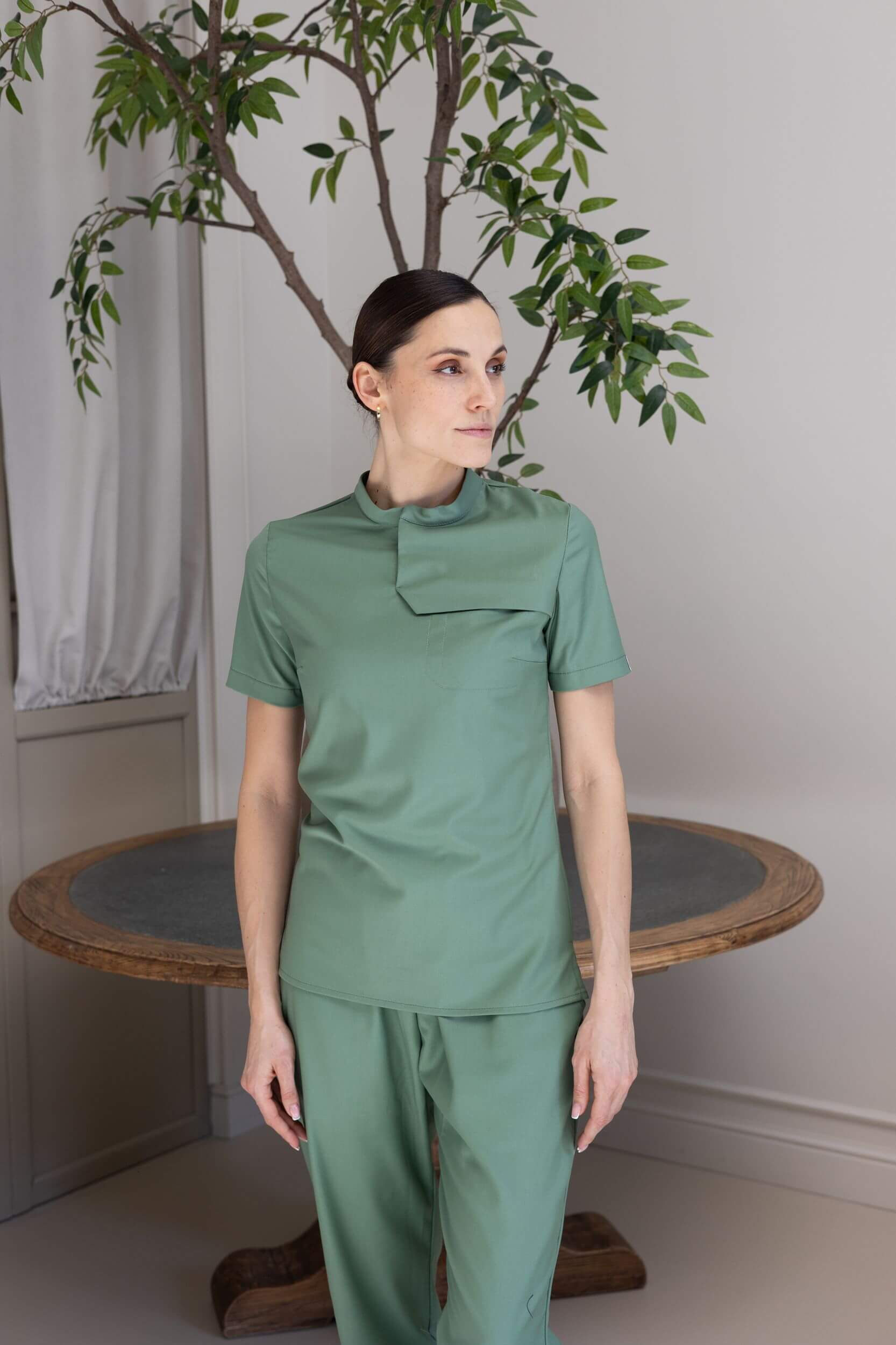 Женская медицинская блуза Гроссо в фисташковом оттенке — свежий и спокойный акцент в профессиональном гардеробе. Аккуратный полуприлегающий крой подчёркивает силуэт, сохраняя комфорт и свободу движений на протяжении всей смены. Лаконичный вырез на шее с кнопками добавляет удобство и современный характер модели.