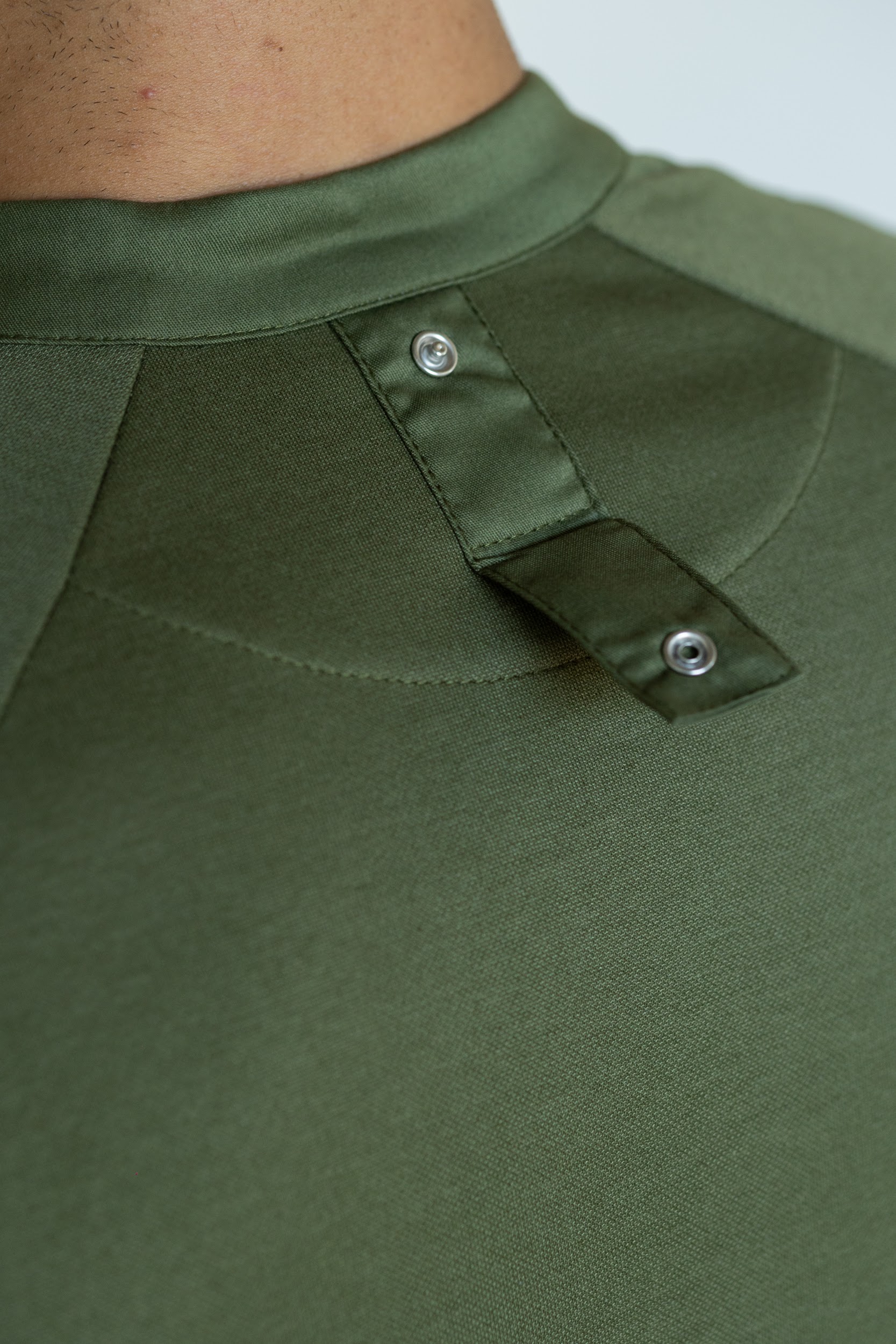 Передняя часть рубашки более плотная и практически не тянется. Спинка и рукава выполнены из трикотажной ткани, что делает работу шефа на кухне более комфортной.