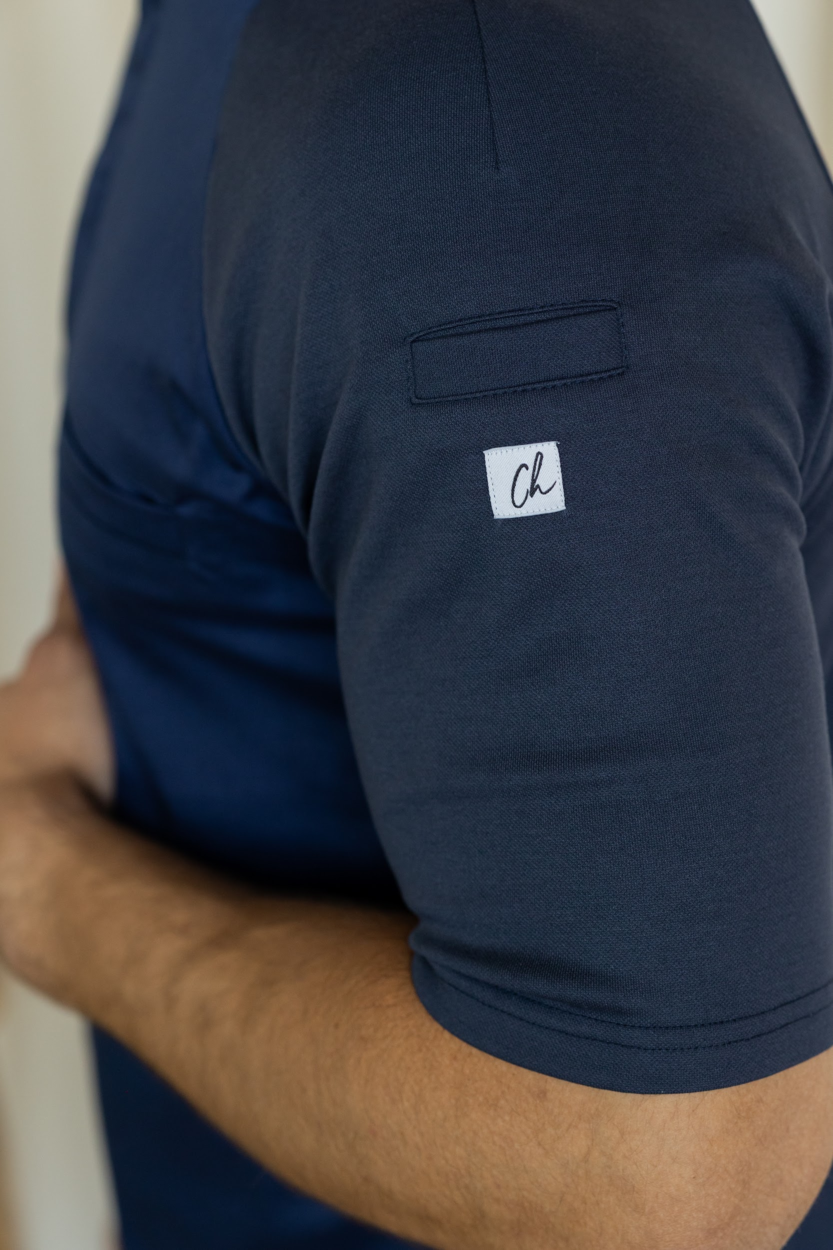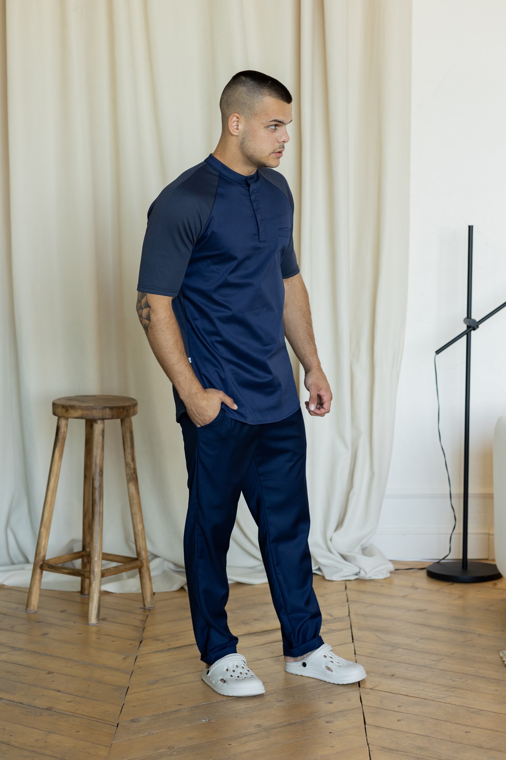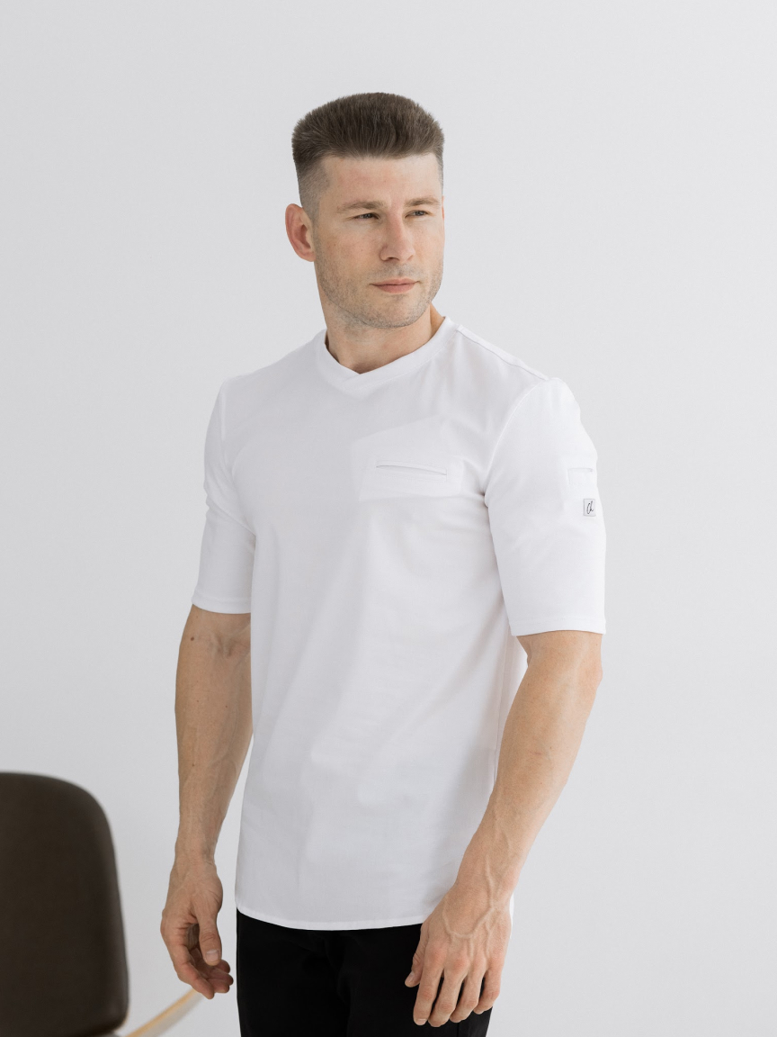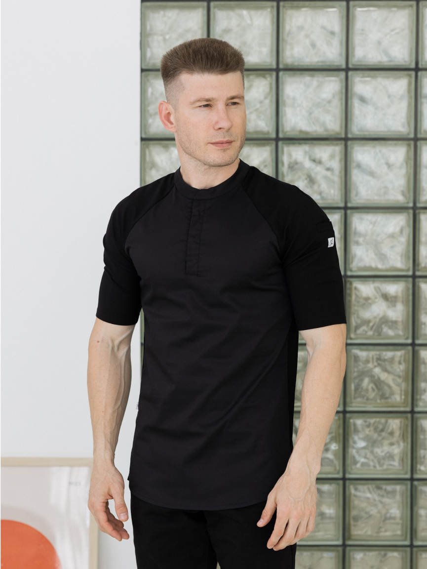 Передняя часть рубашки более плотная и практически не тянется. Спинка и рукава выполнены из трикотажной ткани, что делает работу шефа на кухне более комфортной.
