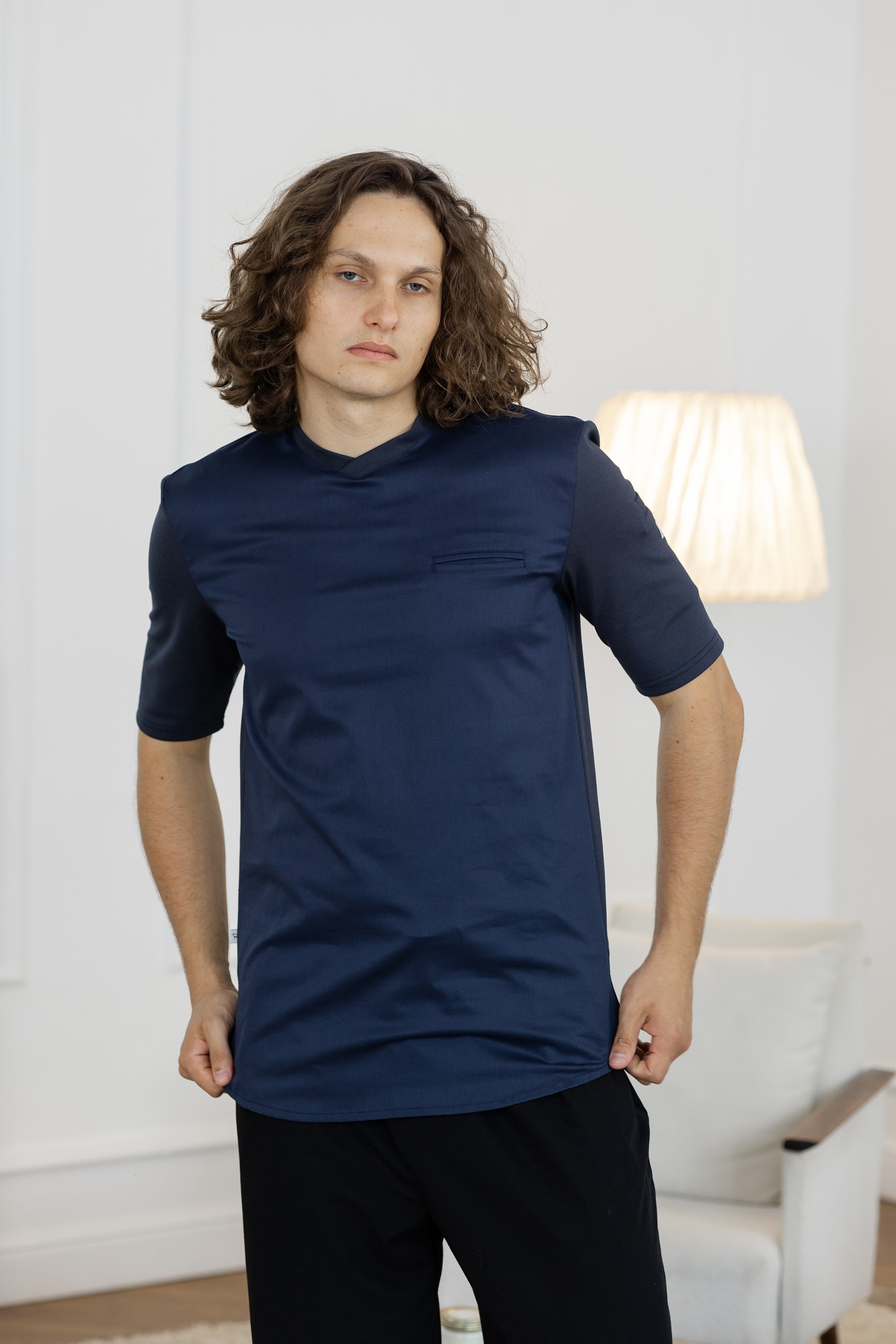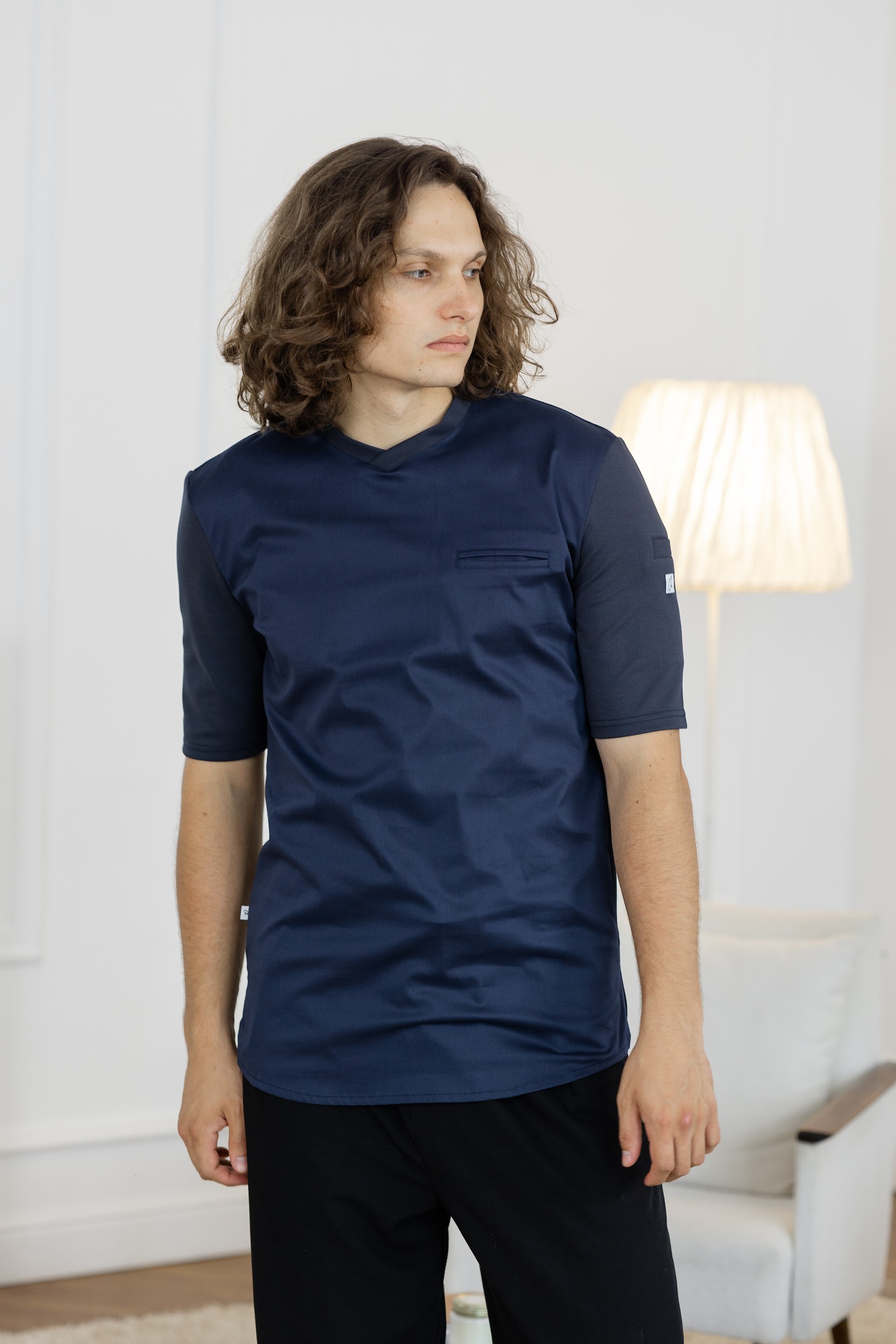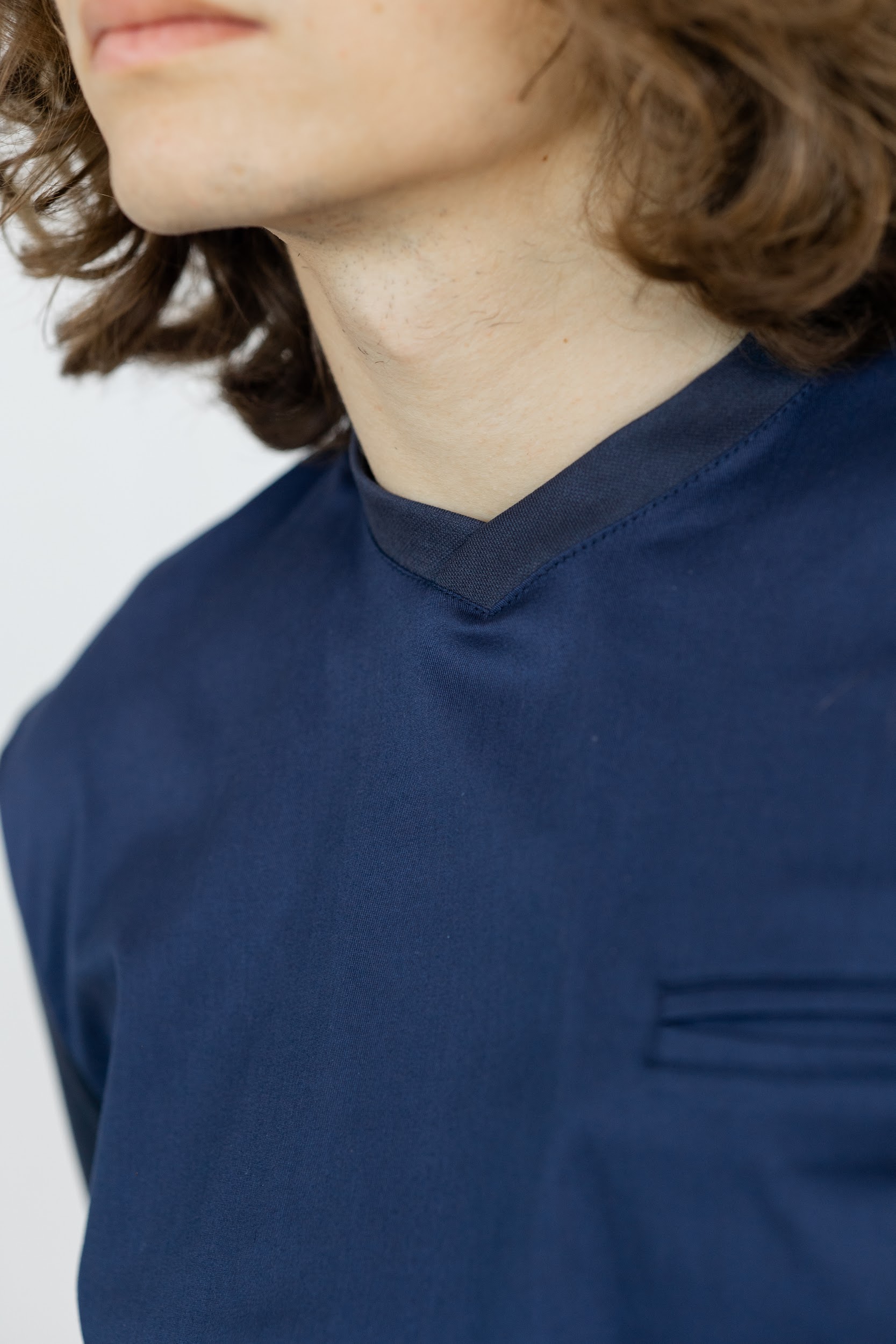 Короткий рукав обеспечивает свободу движений, нагрудный карман добавляет практичности для хранения бейджа, ручки или блокнота. Темно-синий цвет подчеркивает профессионализм и позволяет легко сочетать рубашку с любыми медицинскими брюками. Материал хорошо переносит частые стирки, не теряя форму и насыщенность цвета, а классический дизайн останется актуальным для любого гардероба медика.