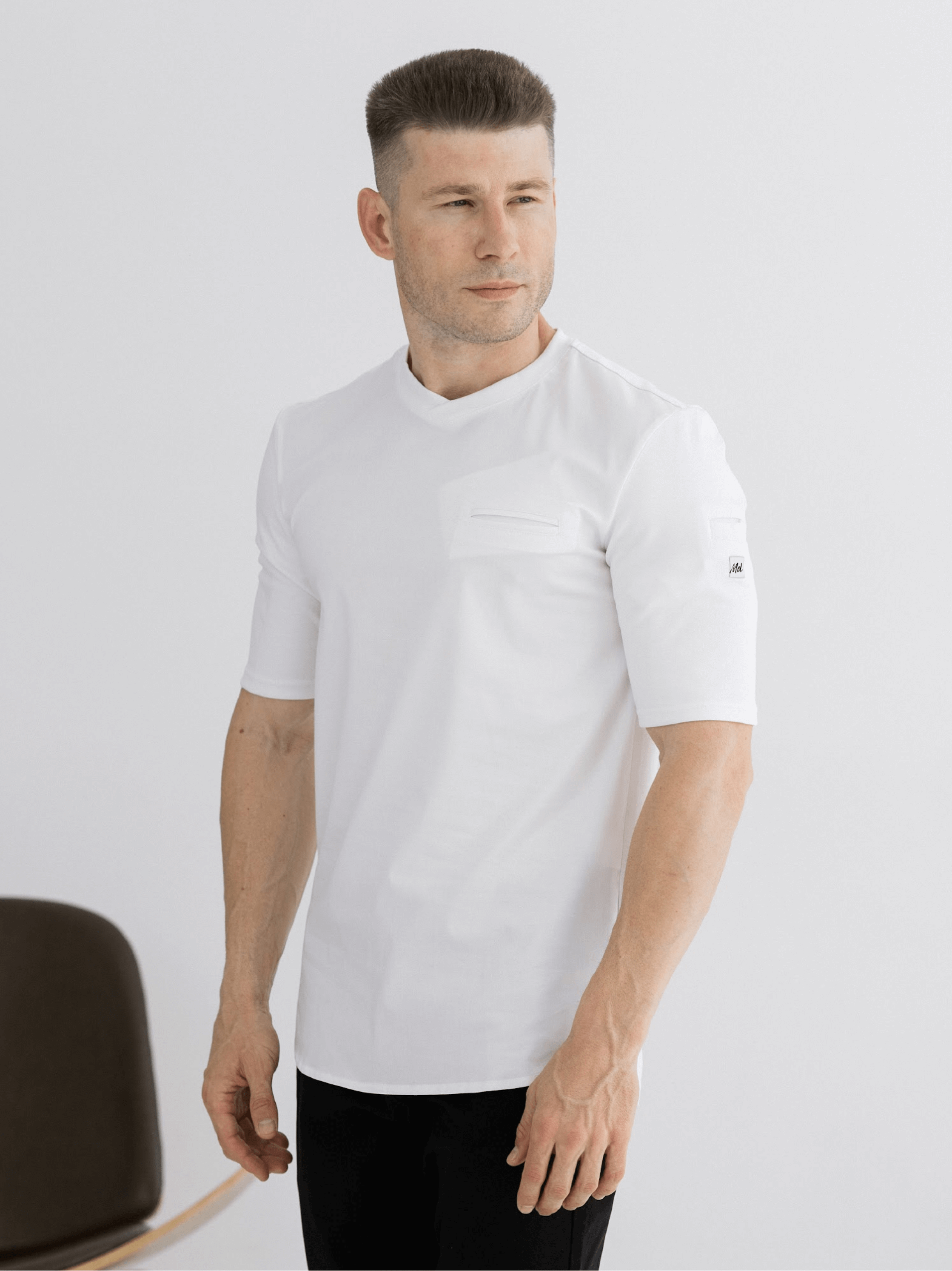 Короткий рукав обеспечивает свободу движений, нагрудный карман добавляет практичности для хранения бейджа, ручки или блокнота. Темно-синий цвет подчеркивает профессионализм и позволяет легко сочетать рубашку с любыми медицинскими брюками. Материал хорошо переносит частые стирки, не теряя форму и насыщенность цвета, а классический дизайн останется актуальным для любого гардероба медика.
