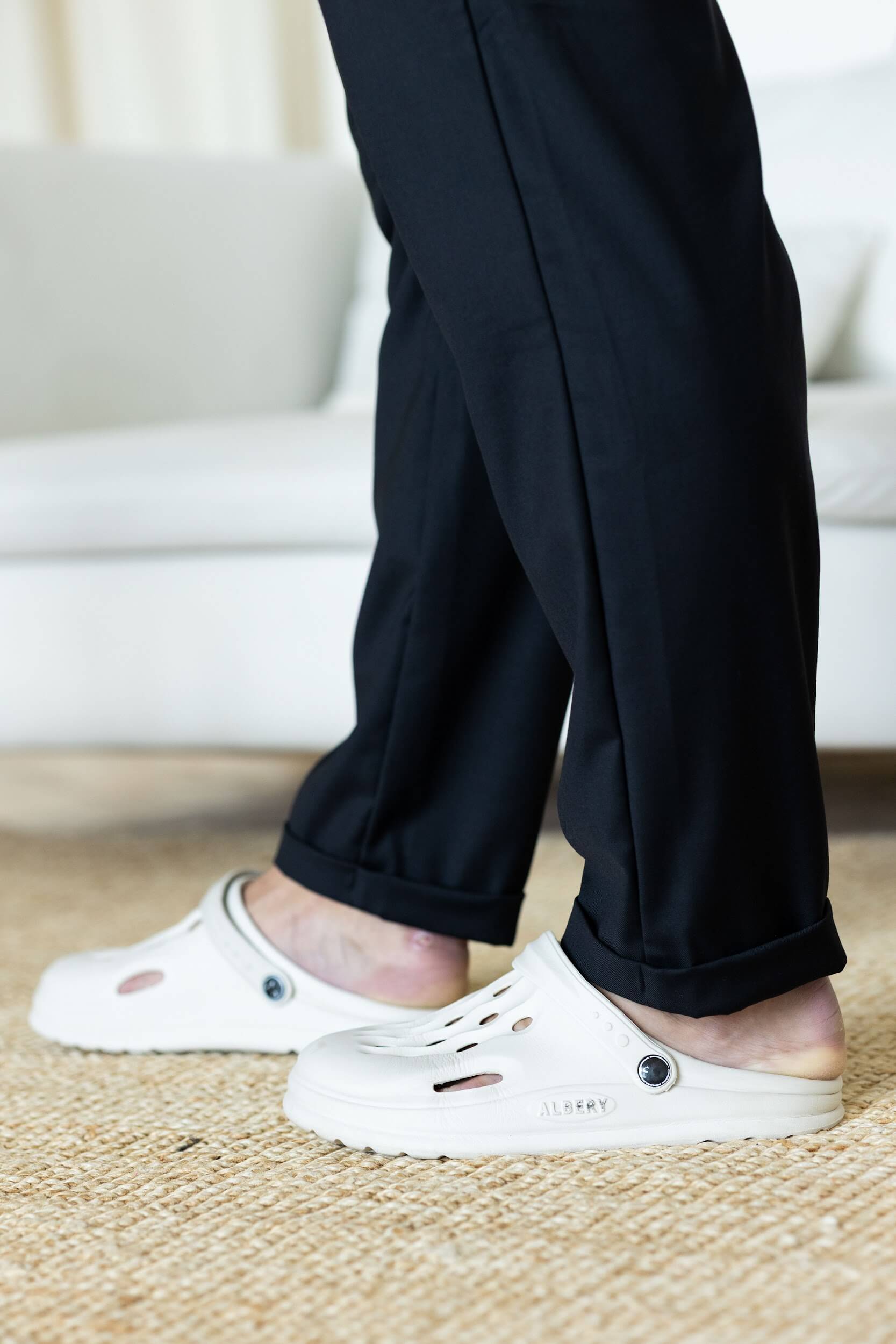 Функциональные боковые карманы позволяют держать под рукой необходимые мелочи и инструменты на смене. Лаконичный дизайн сочетается с униформой любого цвета, а классический черный оттенок подчеркивает строгость и профессионализм. Эти брюки подходят как для медучреждений, так и для лабораторий.