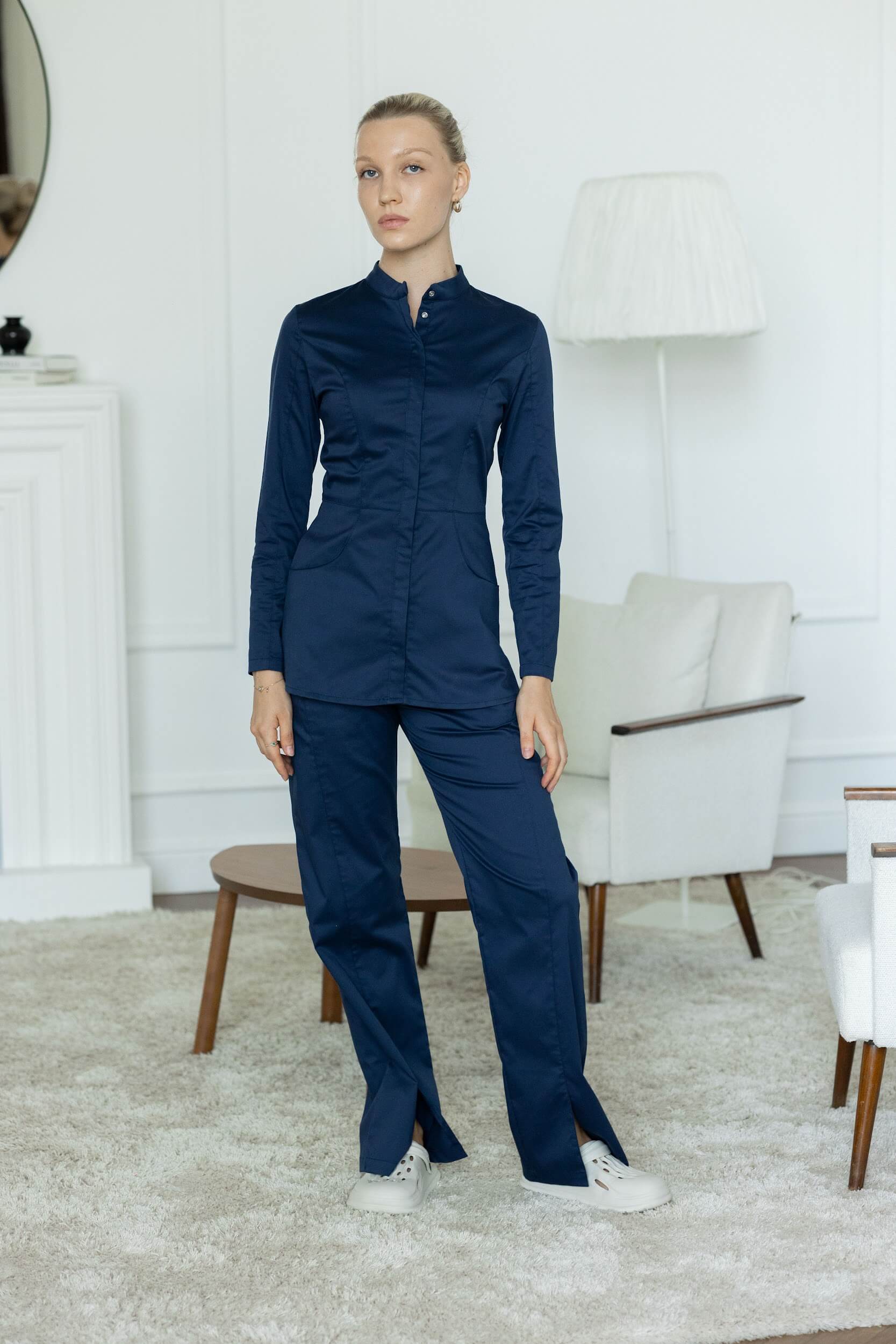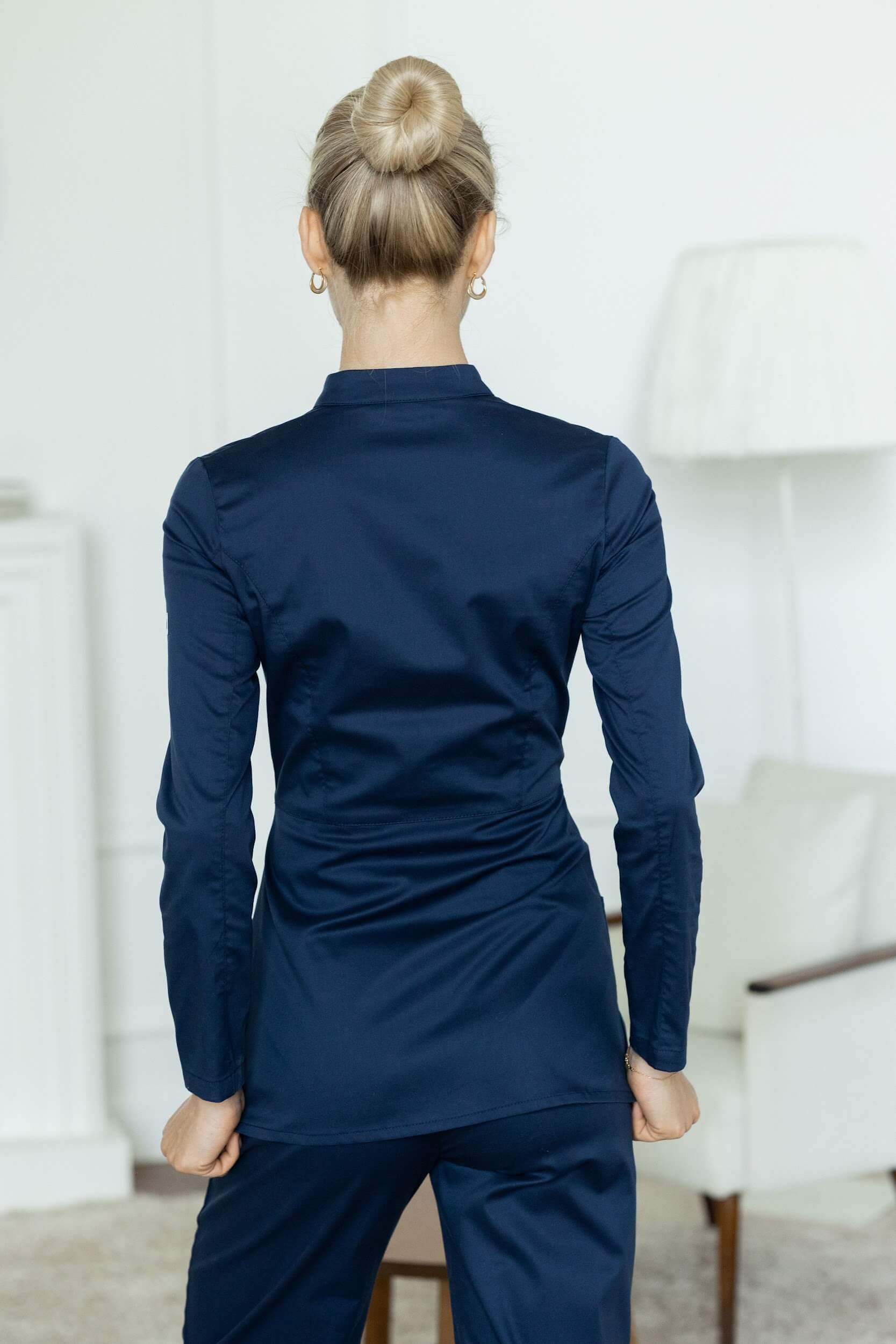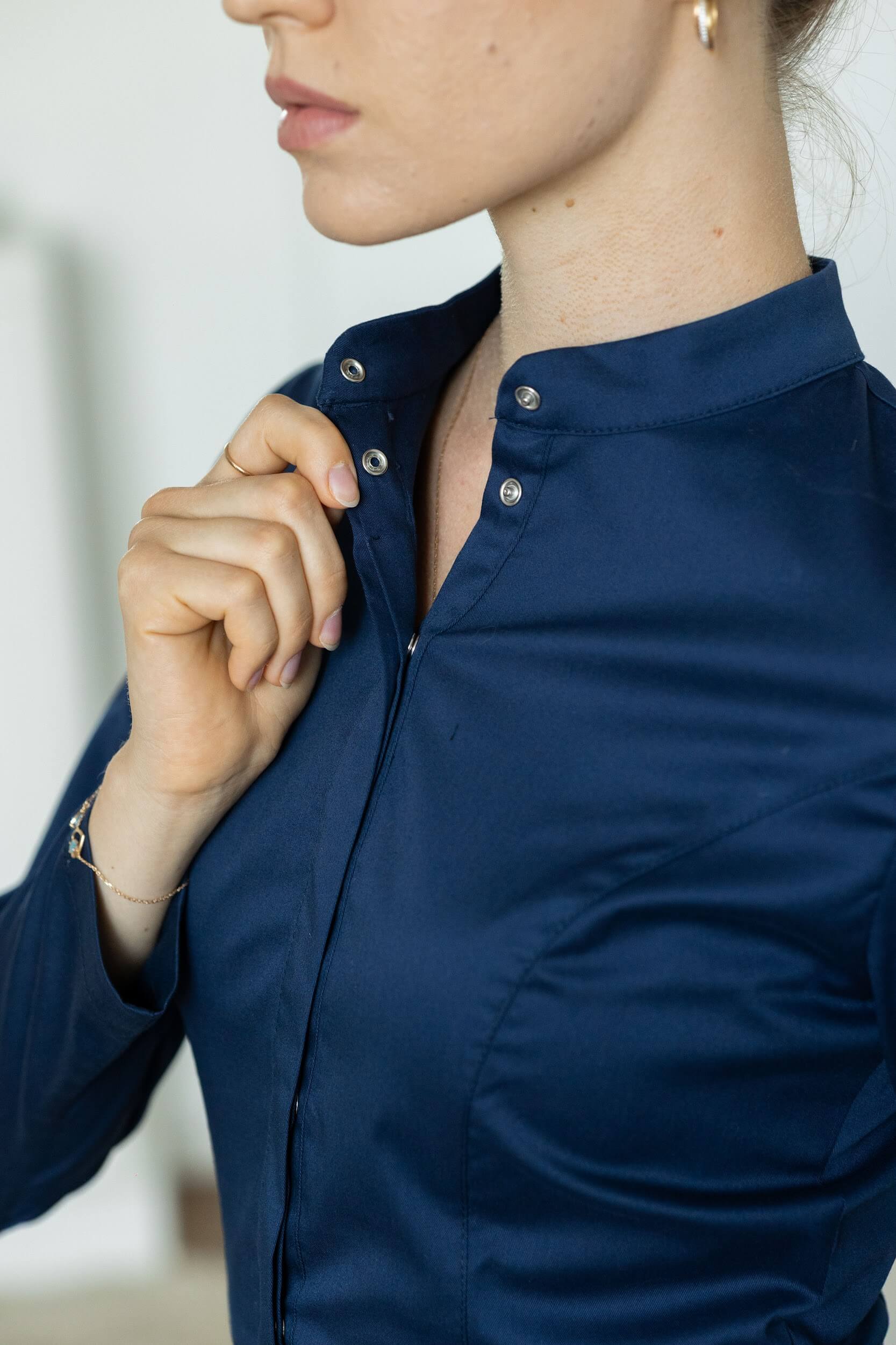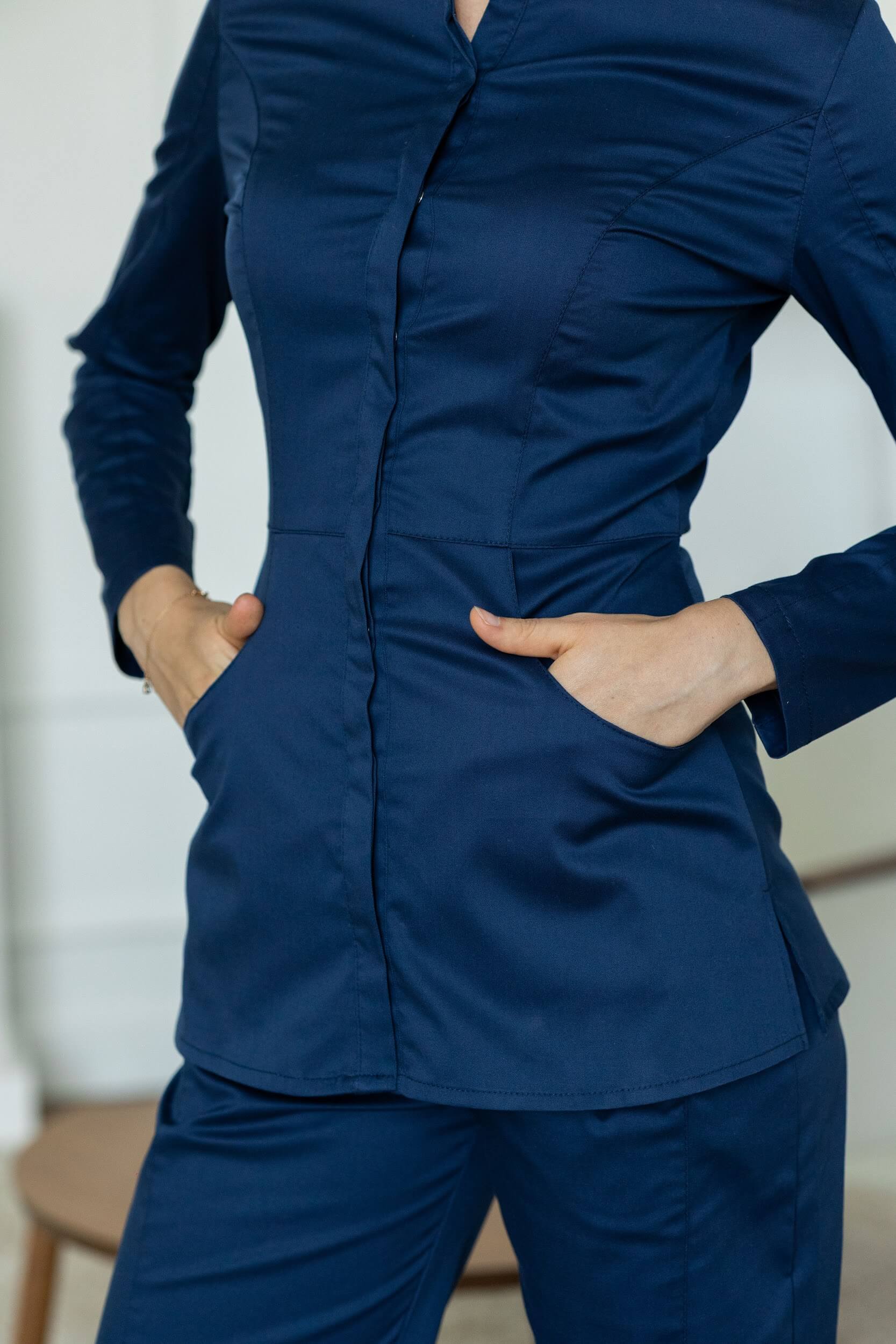 Ткань легко стирается, быстро сохнет, сохраняет насыщенный цвет и опрятный вид даже при ежедневной носке. Темно-синий оттенок придаёт образу уверенность и статус, отлично сочетается с разными вариантами медицинских брюк. Рубашка идеально подойдёт для работы в клинике, лаборатории и салоне красоты, создавая завершённый и стильный комплект.