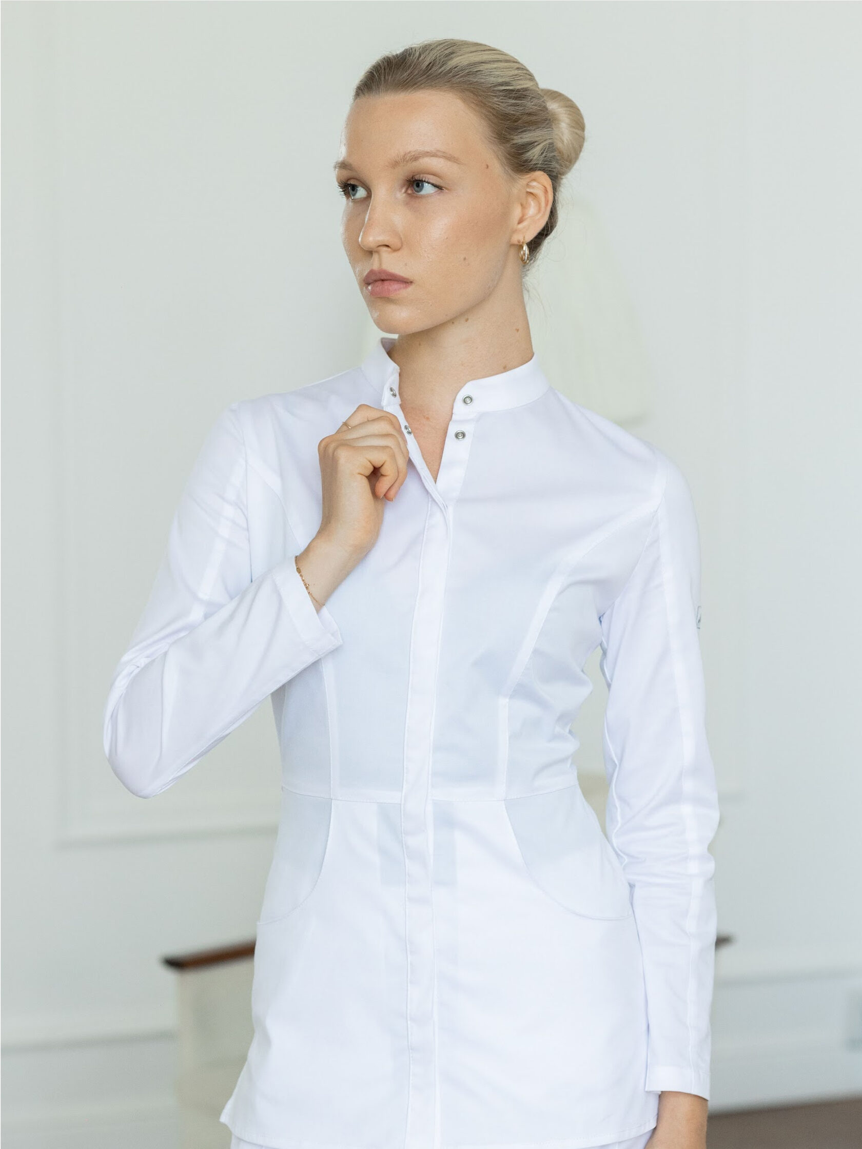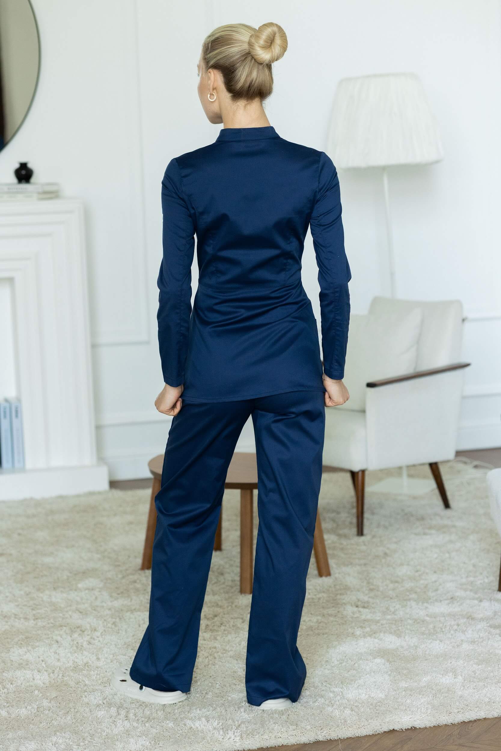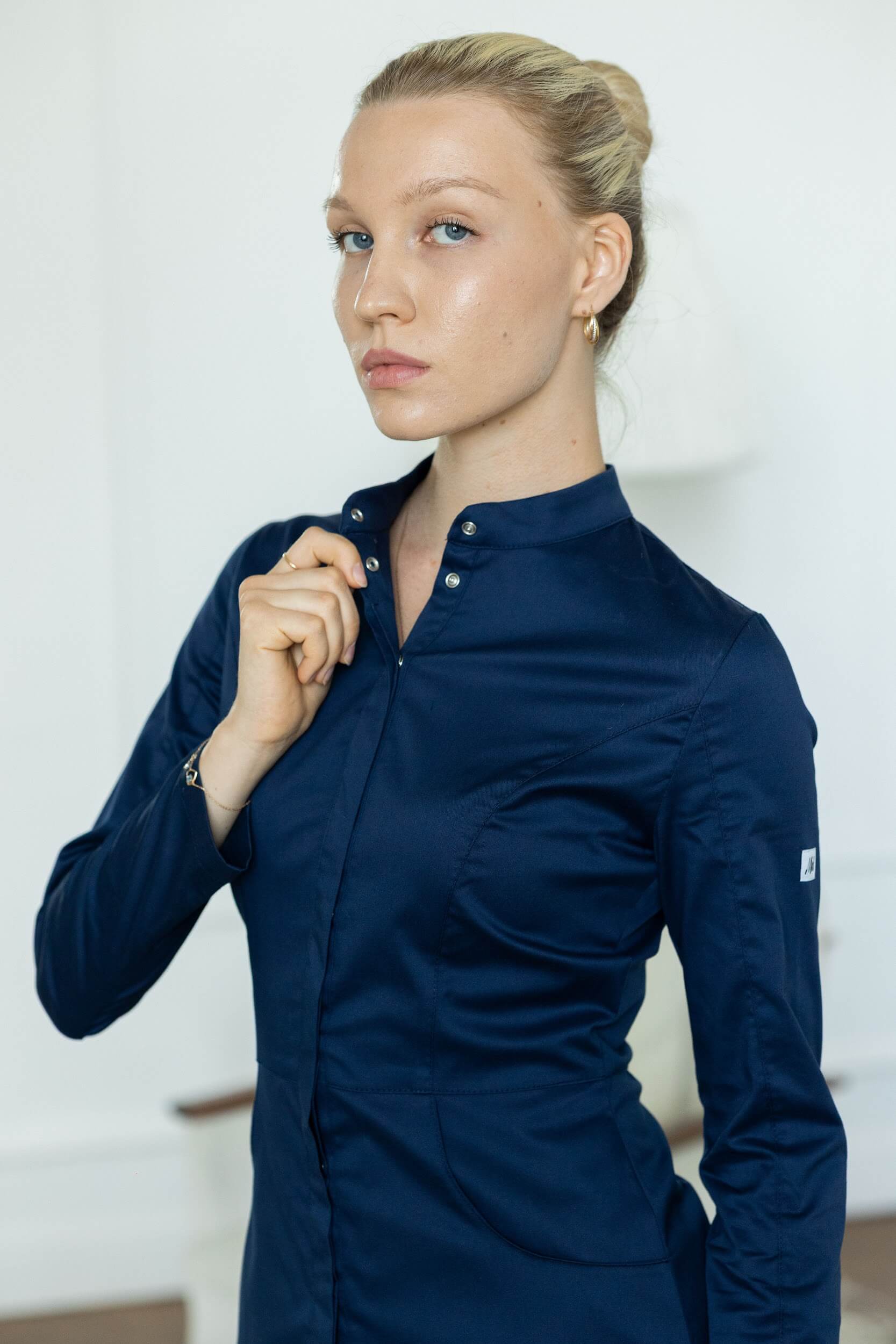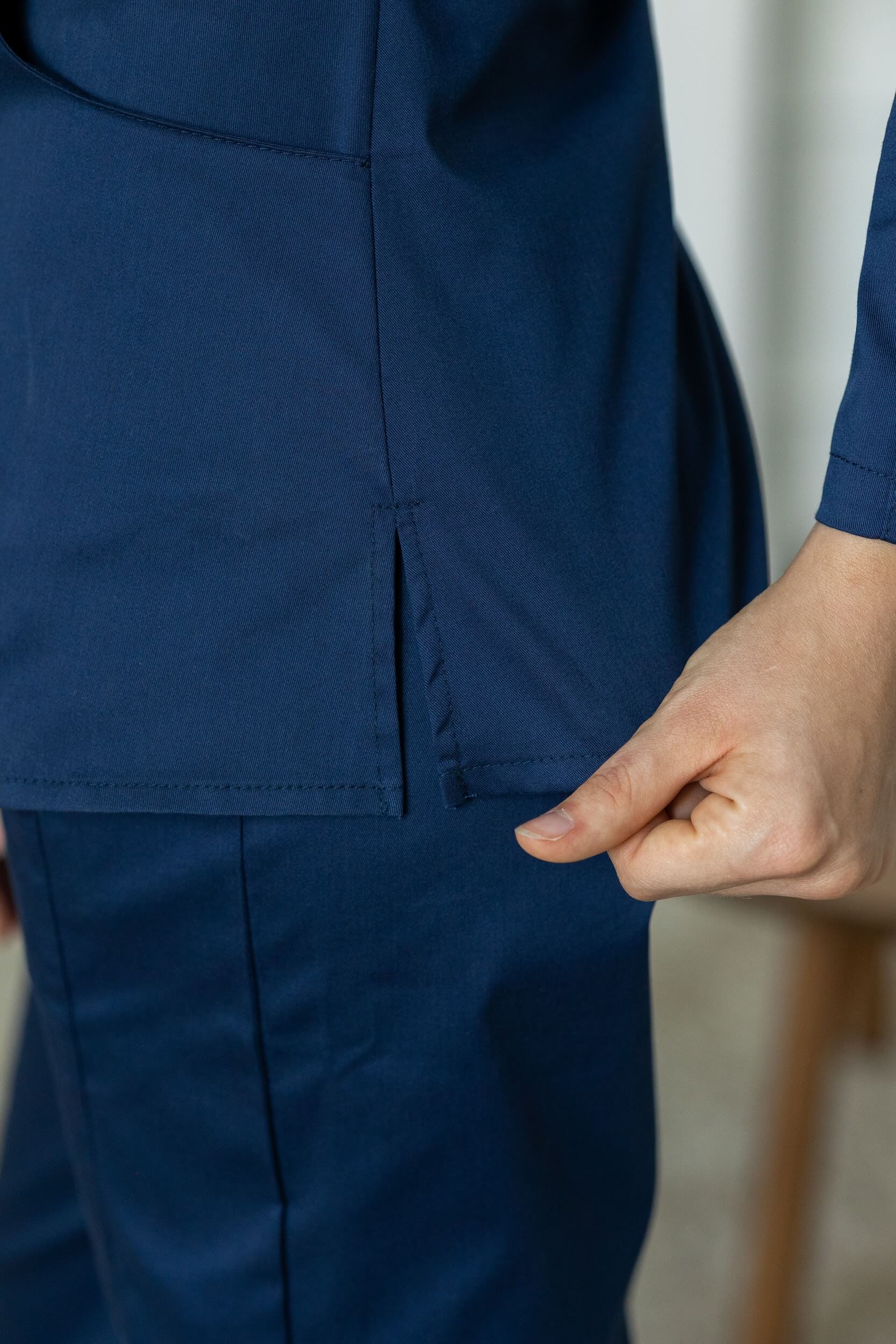 Ткань легко стирается, быстро сохнет, сохраняет насыщенный цвет и опрятный вид даже при ежедневной носке. Темно-синий оттенок придаёт образу уверенность и статус, отлично сочетается с разными вариантами медицинских брюк. Рубашка идеально подойдёт для работы в клинике, лаборатории и салоне красоты, создавая завершённый и стильный комплект.