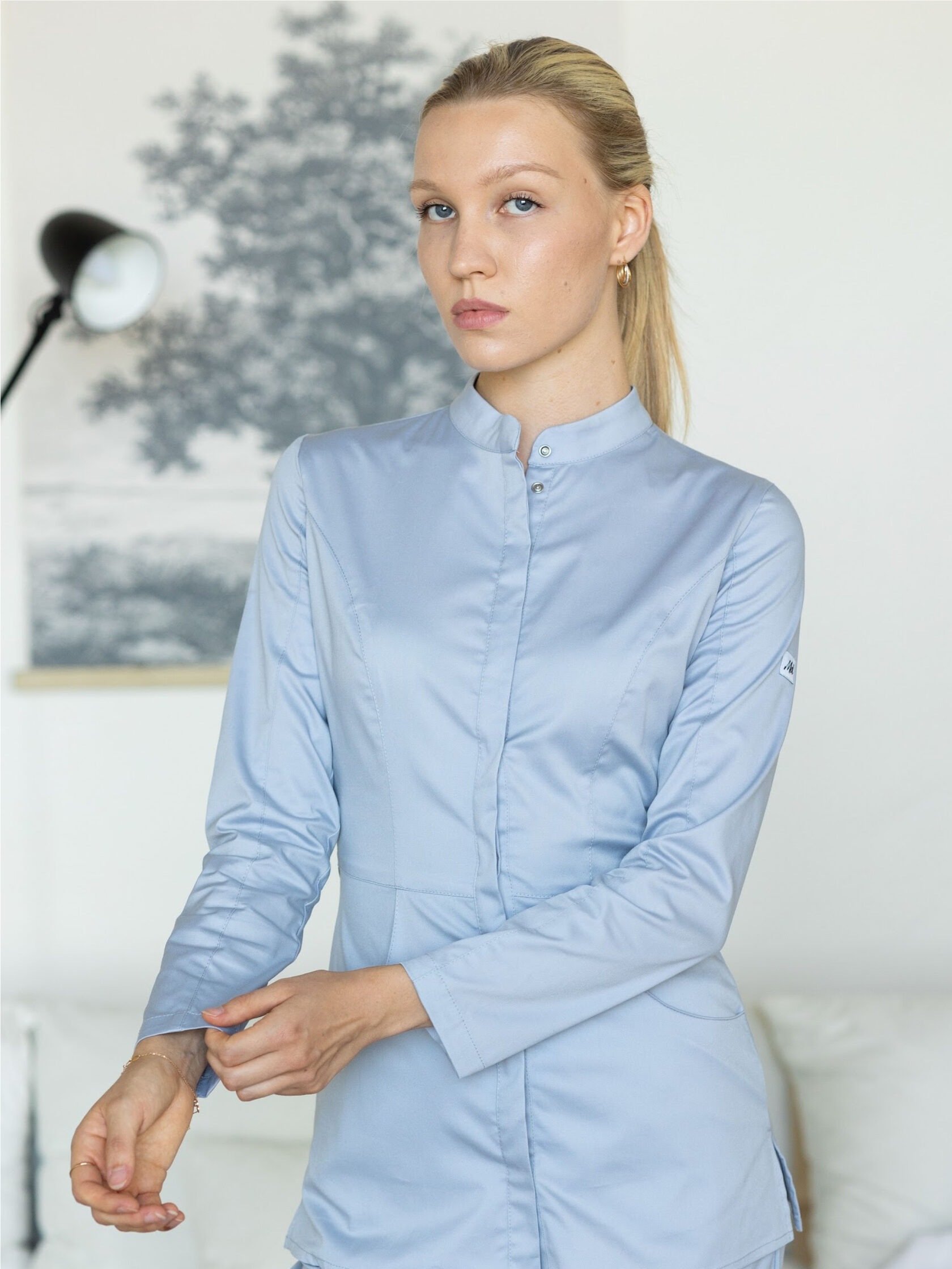 Медицинская рубашка Lukas женская темно-синяя — строгий и современный вариант для профессионалов, ценящих аккуратность и функциональность. Прямой приталенный силуэт с лаконичной стойкой подчёркивает фигуру, а длинные рукава делают модель универсальной и для смен. На талии расположены два удобных кармана для инструментов или необходимых мелочей.