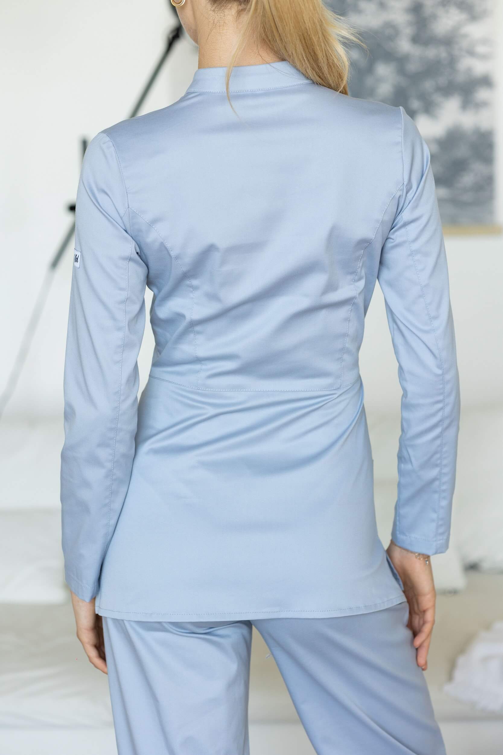 Медицинская рубашка Lukas женская серо-голубая — сочетание минимализма, удобства и свежего оттенка для стильного медицинского гардероба. Приталенный силуэт с аккуратной стойкой и скрытой застёжкой подчёркивает профессиональный образ, а длинные рукава делают модель универсальной для любого времени года. На талии предусмотрены два удобных кармана для инструментов и мелочей, что увеличивает функциональность изделия.