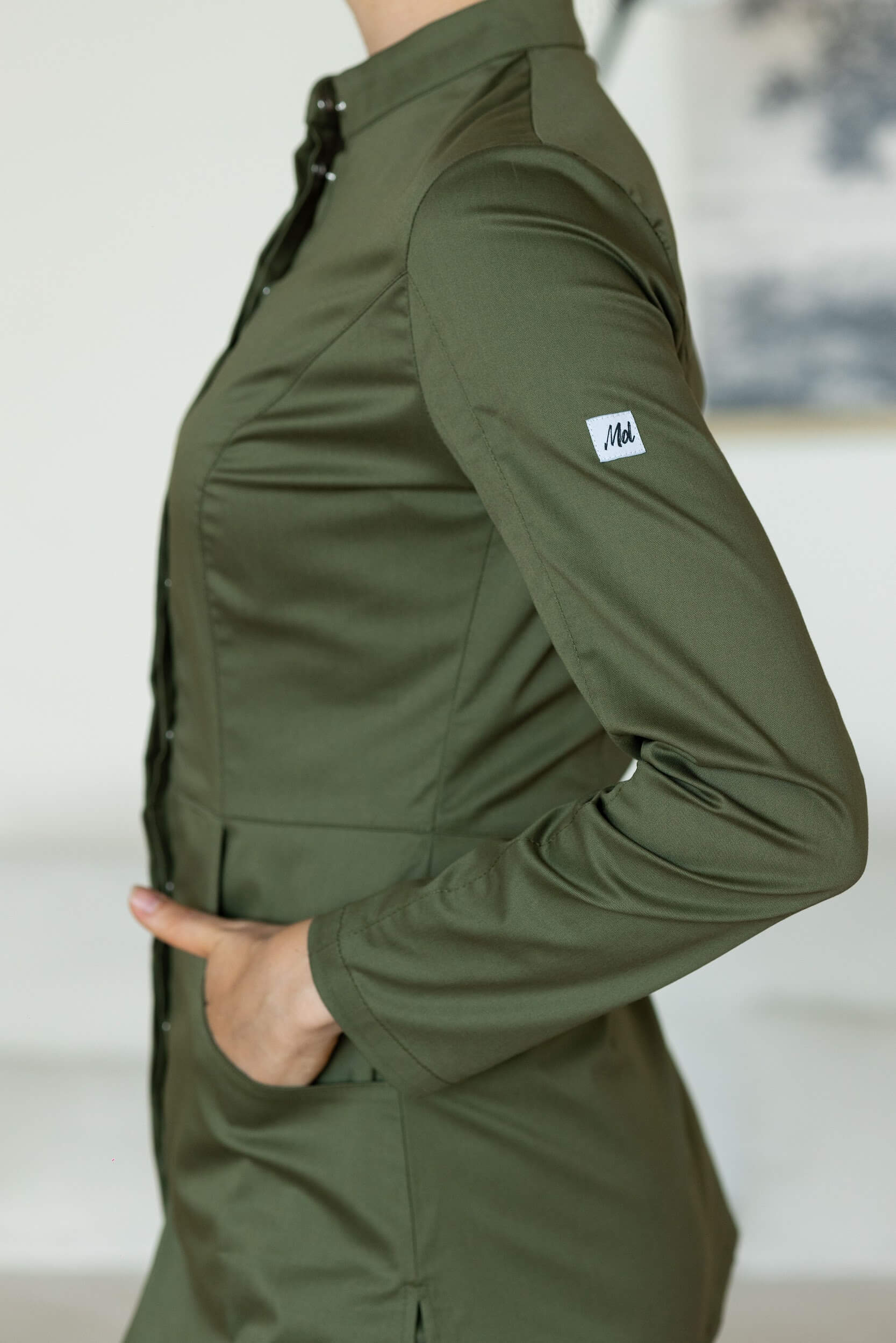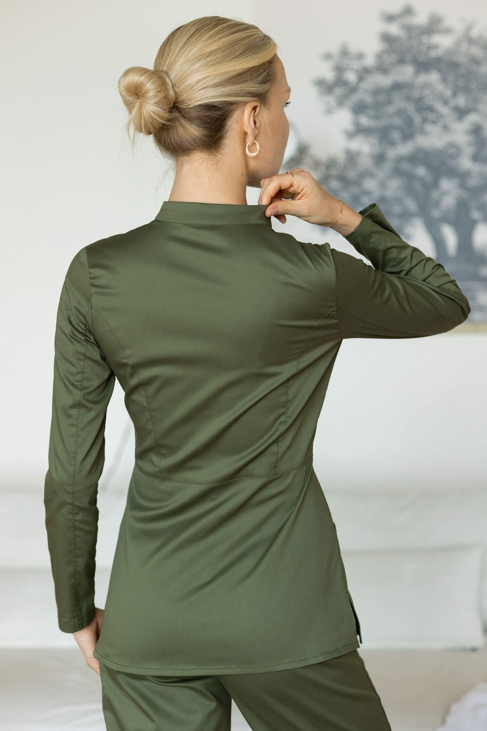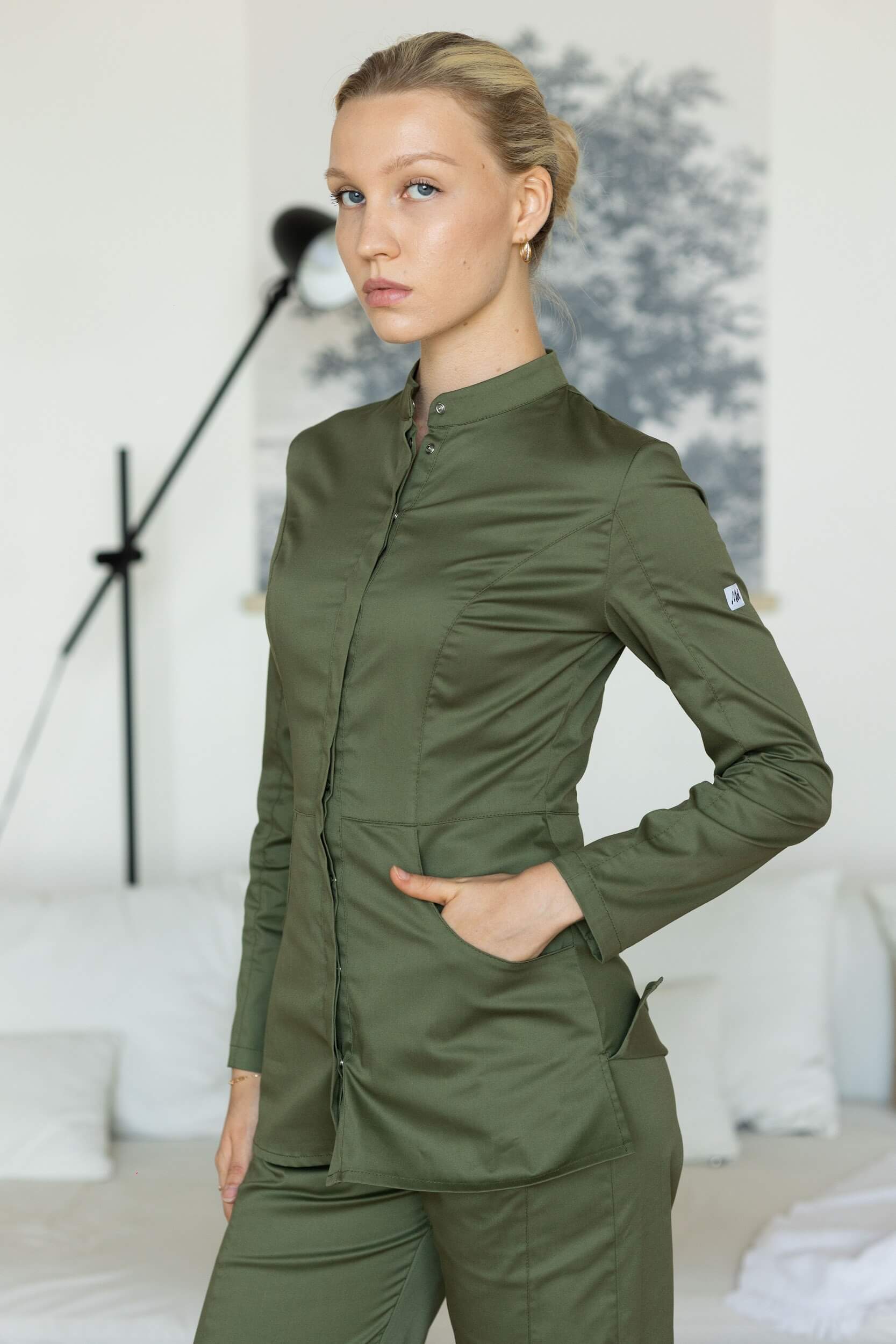 Медицинская рубашка Lukas женская хаки — стильное и оригинальное решение для тех, кто ценит индивидуальный подход к рабочему гардеробу. Приталенный крой с лаконичной стойкой визуально стройнит и подчёркивает фигуру, длинные рукава защищают от перепадов температуры. На талии расположены два вместительных кармана для необходимых инструментов и мелочей, что создаёт дополнительное удобство в течение рабочего дня.
