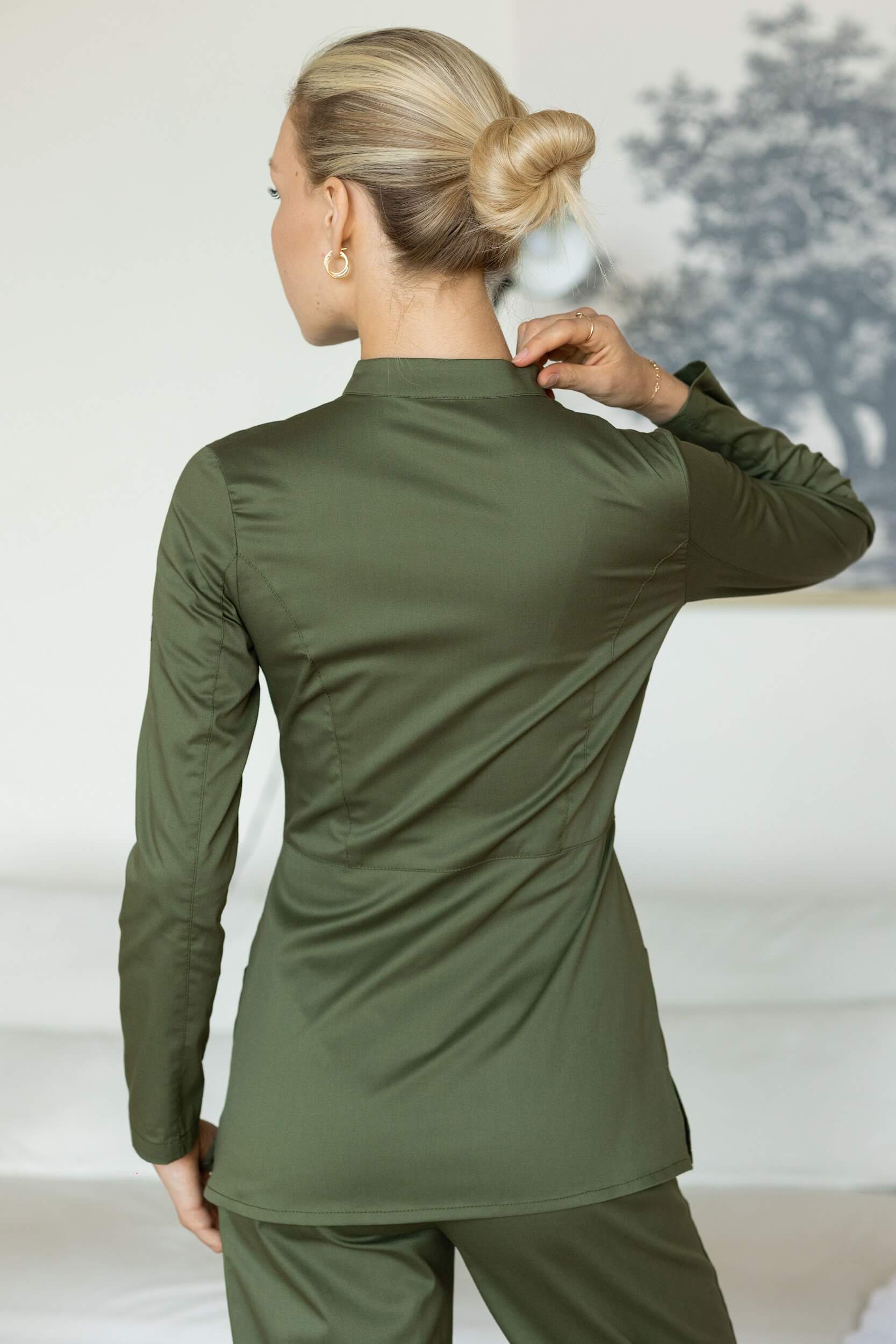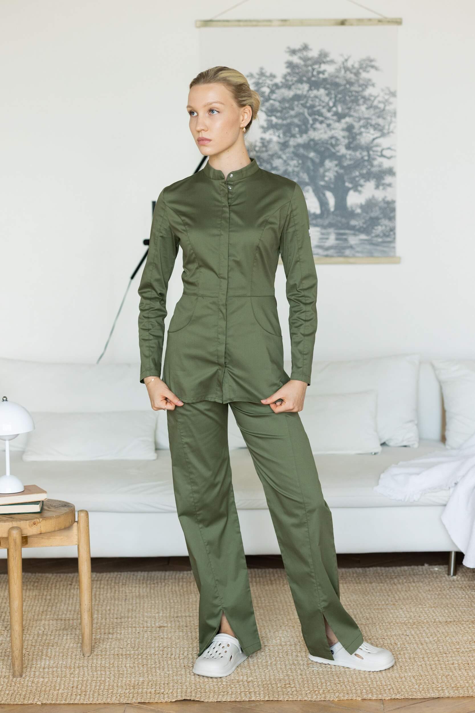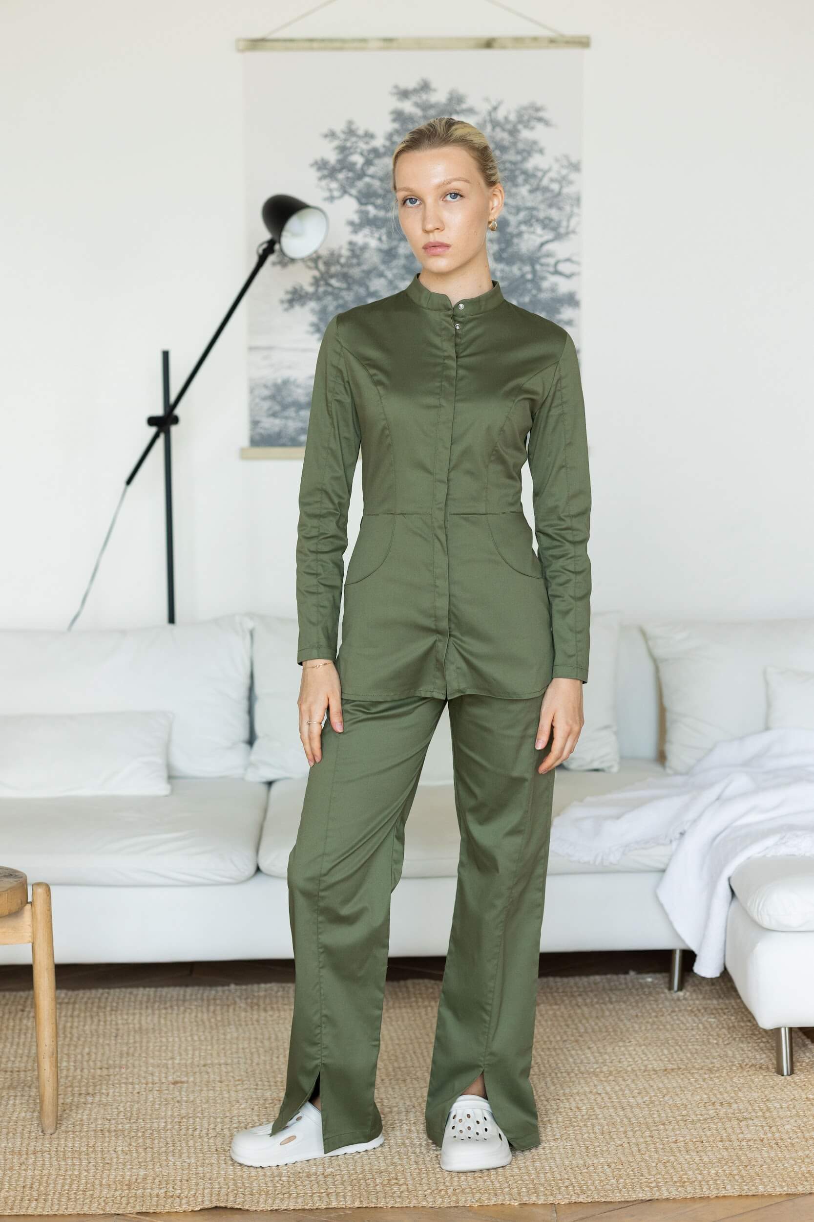 Медицинская рубашка Lukas женская хаки — стильное и оригинальное решение для тех, кто ценит индивидуальный подход к рабочему гардеробу. Приталенный крой с лаконичной стойкой визуально стройнит и подчёркивает фигуру, длинные рукава защищают от перепадов температуры. На талии расположены два вместительных кармана для необходимых инструментов и мелочей, что создаёт дополнительное удобство в течение рабочего дня.