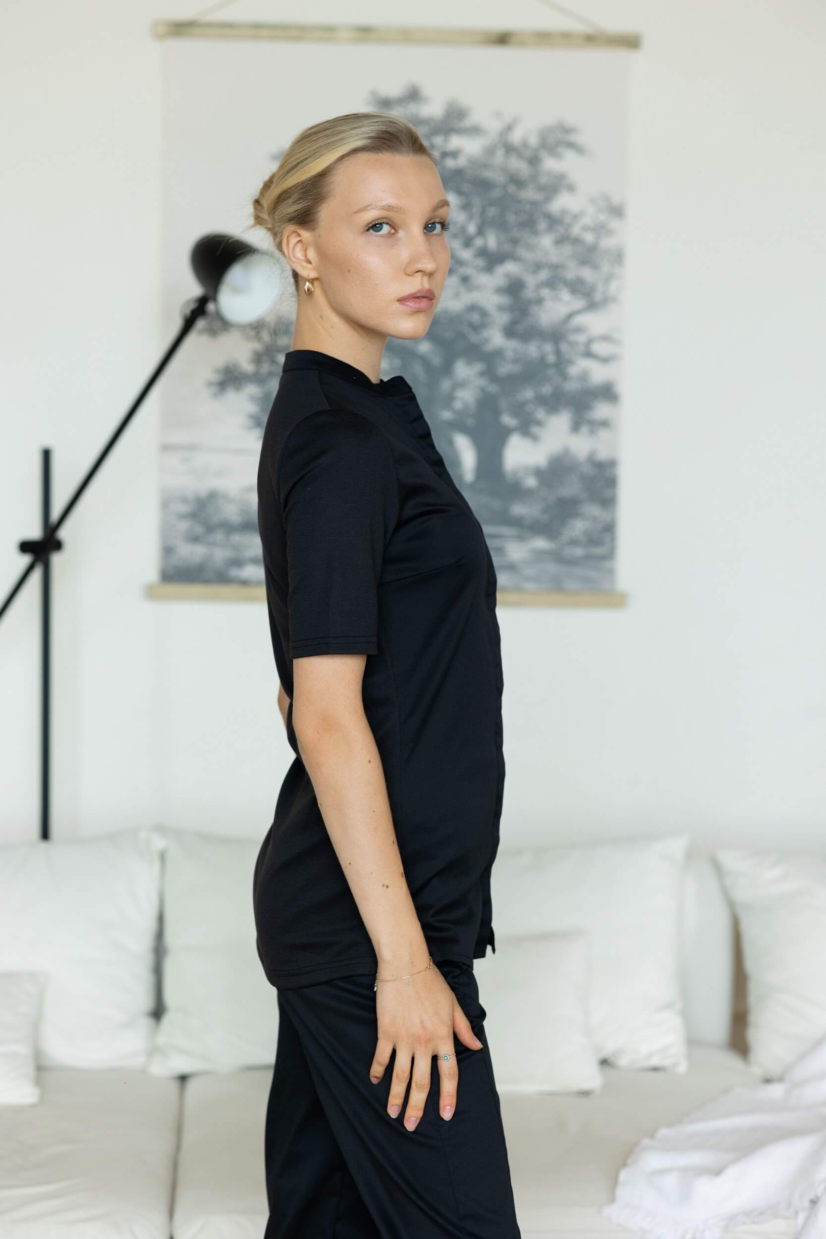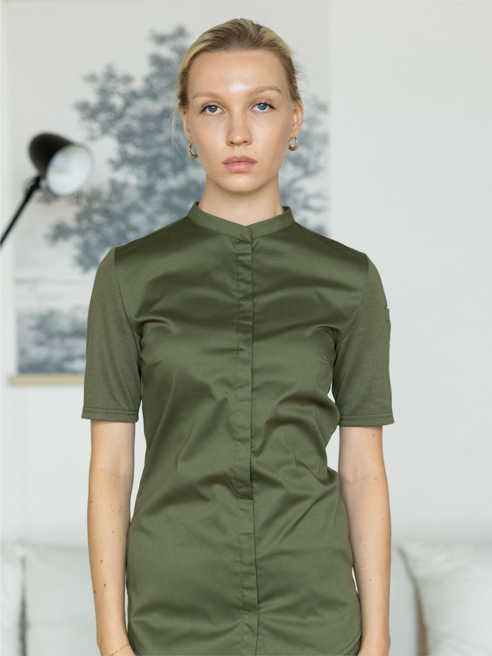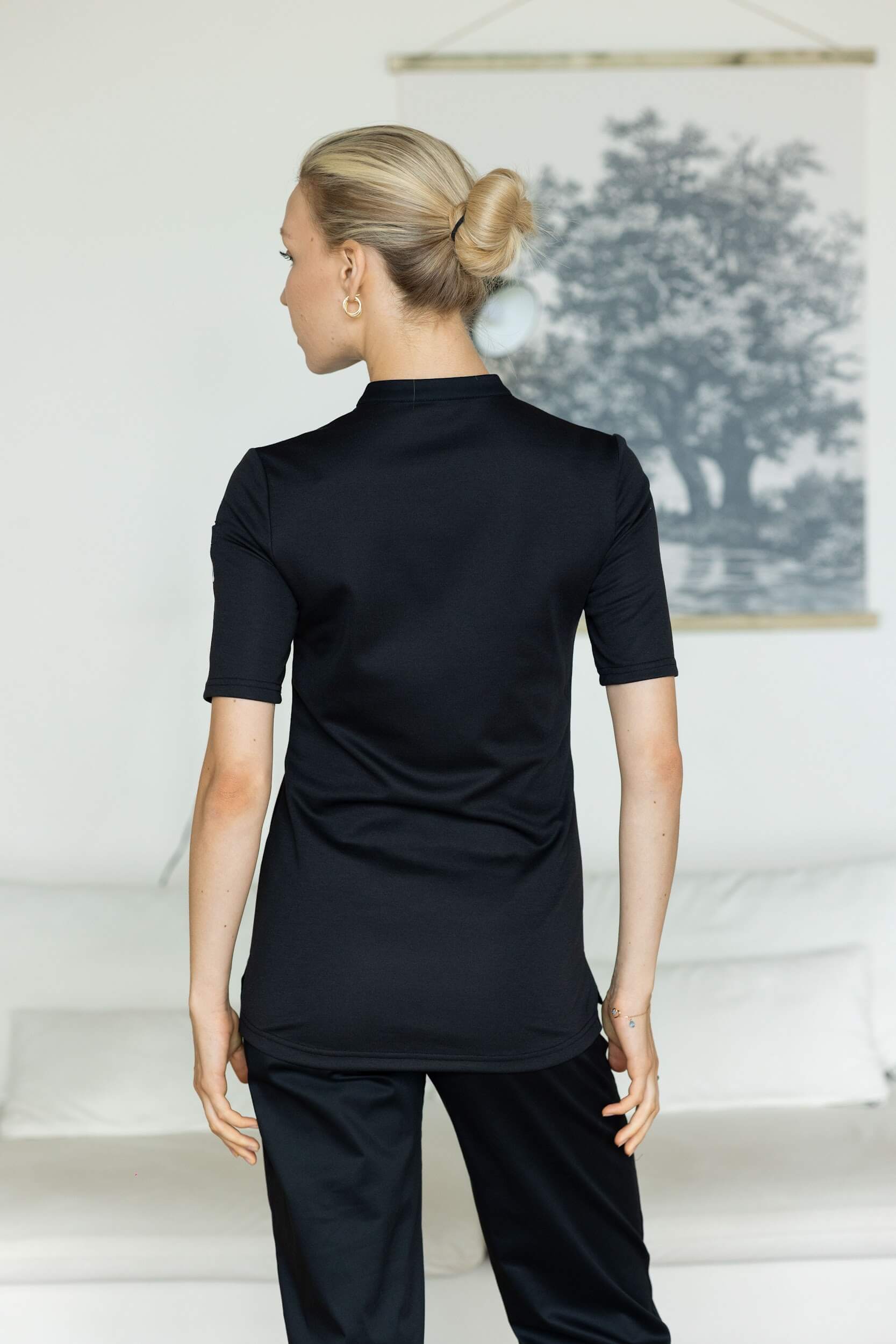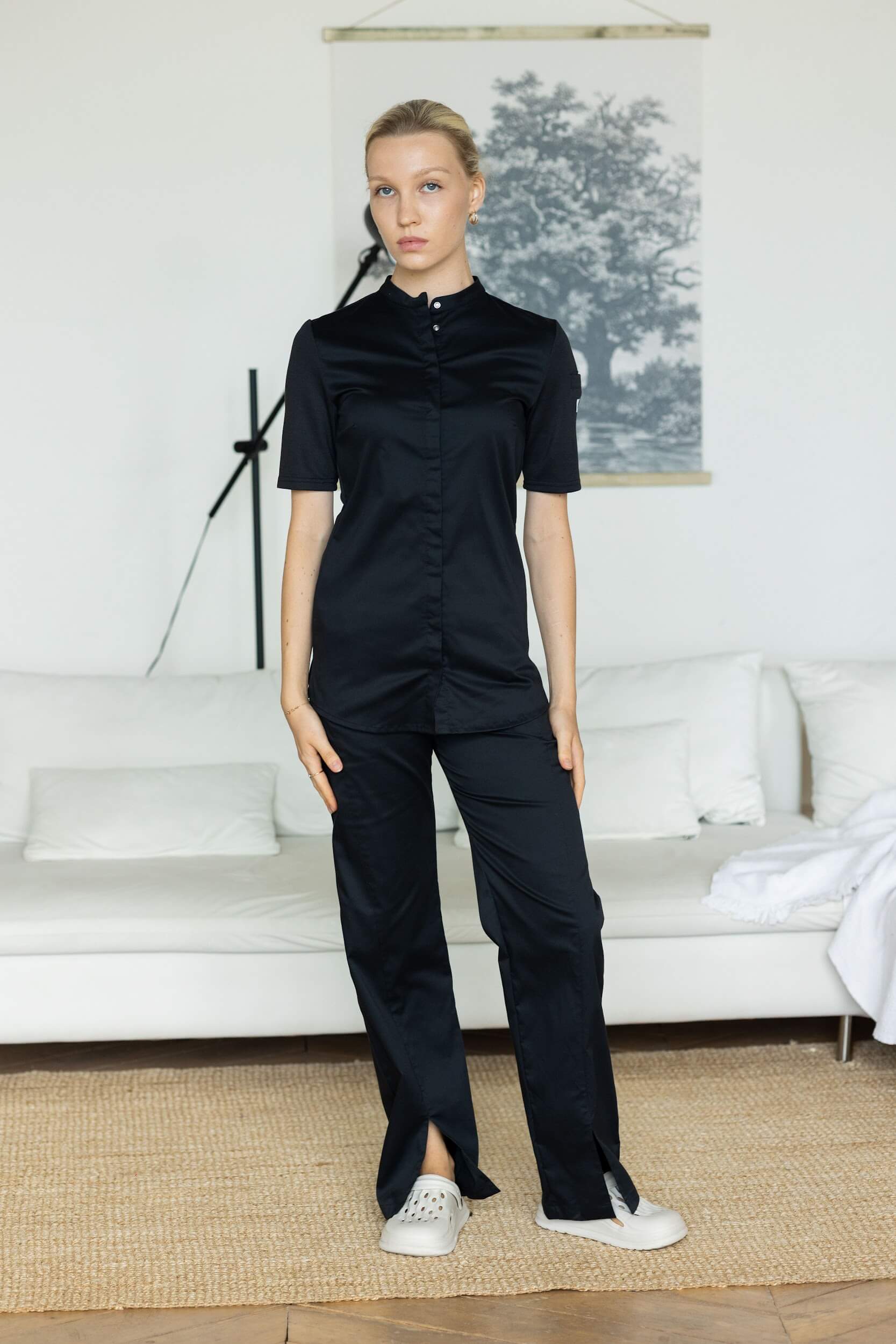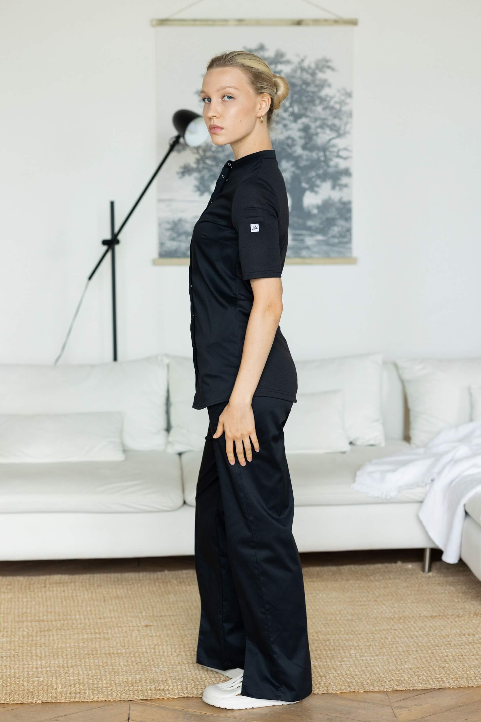 Рубашка изготовлена из гипоаллергенных тканей — полиэфира и эластана, производится в Англии, оснащена кнопками из медицинской стали для долговечности. Она легко стирается, быстро сохнет и сохраняет насыщенный чёрный цвет, что помогает поддерживать профессиональный и аккуратный внешний вид в любых условиях работы.