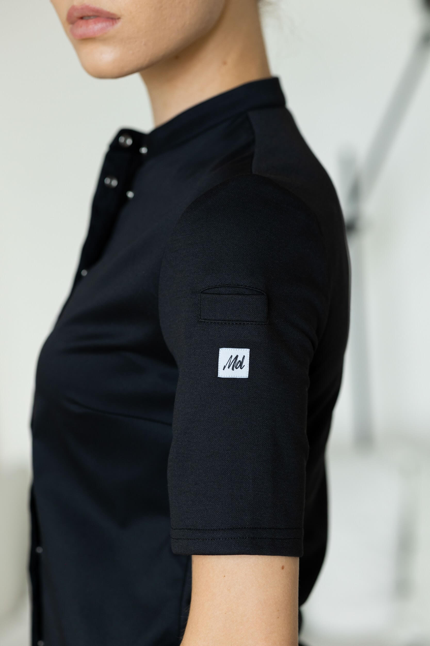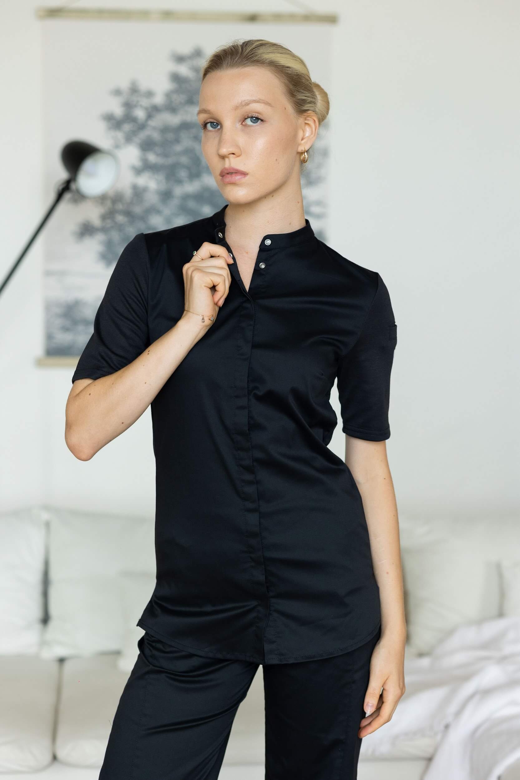 Медицинская рубашка Moulant женская черная — насыщенный и стильный вариант для профессионального образа. Модель выполнена из плотной смесовой ткани на передней части и эластичного трикотажного пике на рукавах и спинке, что обеспечивает свободу движений и комфорт во время длительных смен. Потайной карман на рукаве и практичные карманы на талии придают функциональность.
