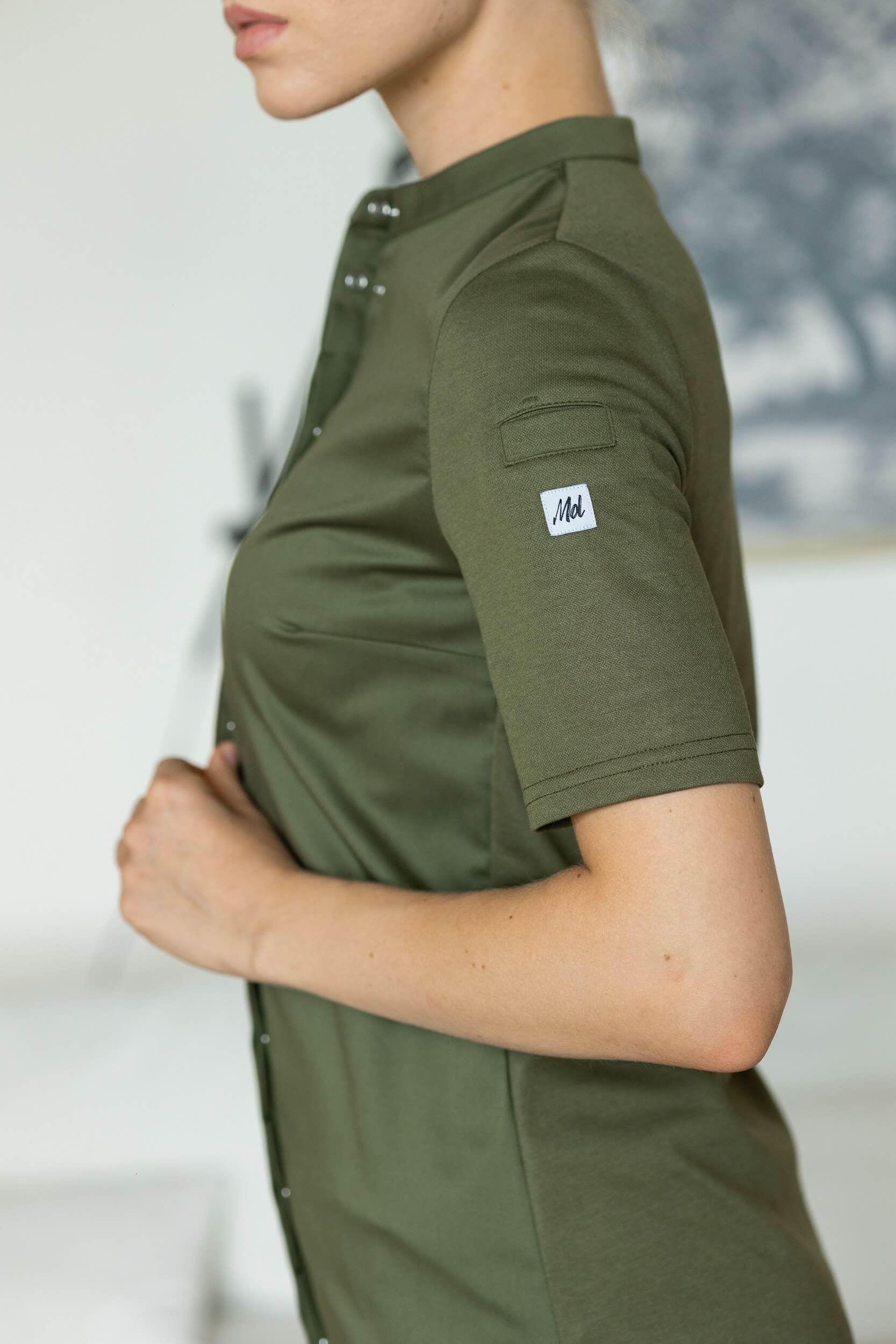 Медицинская рубашка Moulant женская хаки — стильная и функциональная модель для профессиональных медицинских работников. Передняя часть сделана из плотной смесовой ткани, не тянется, а рукава и спинка выполнены из эластичного трикотажного пике, обеспечивающего комфорт и хорошую вентиляцию. На рукаве есть потайной карман.
