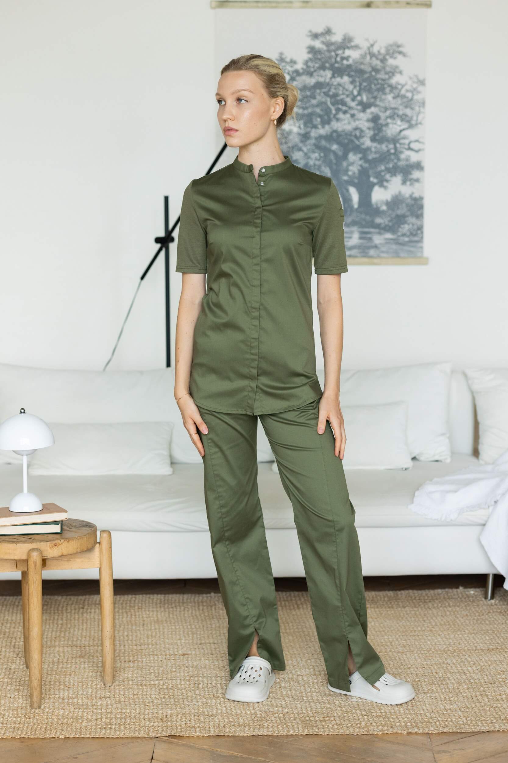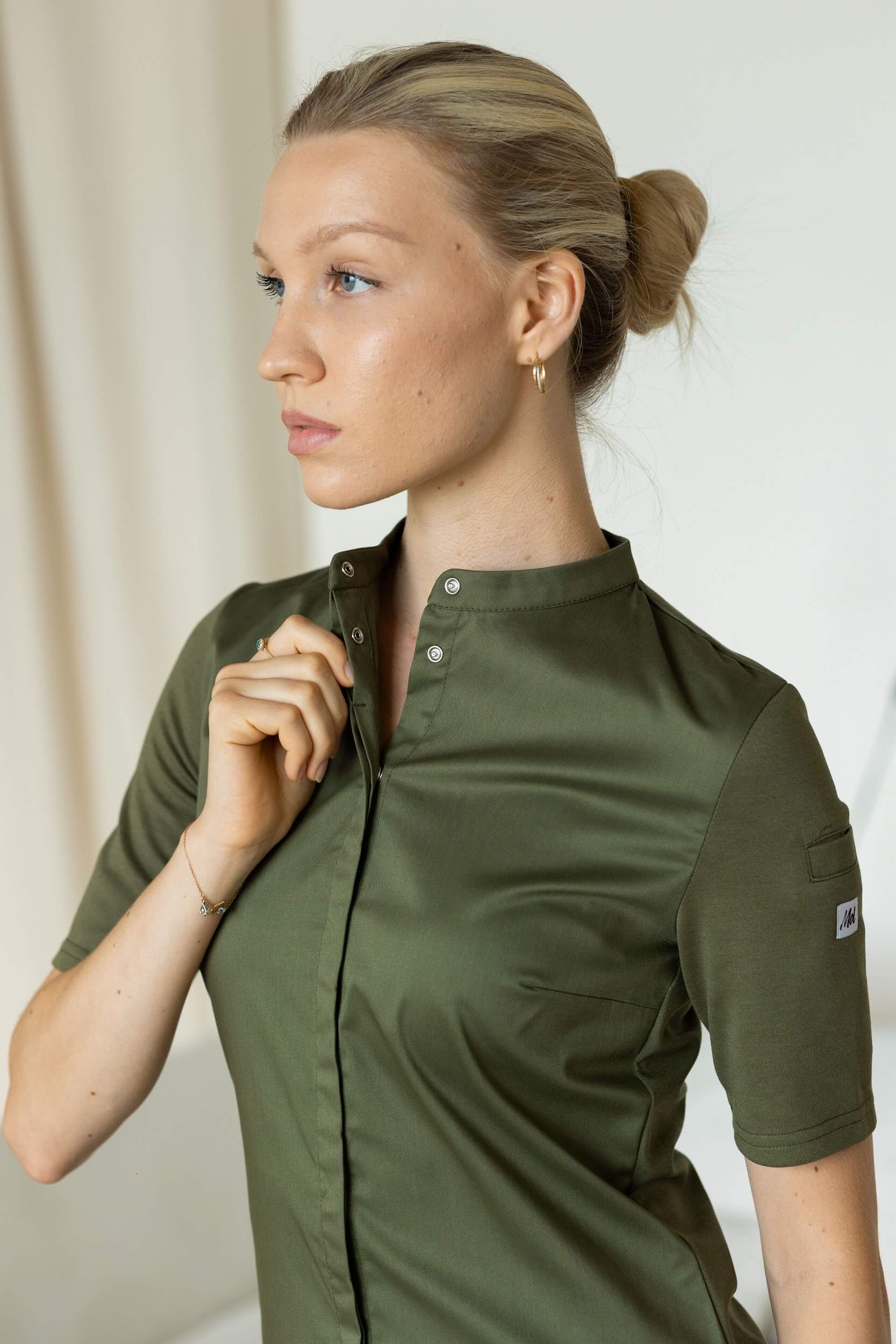 Ткань представляет собой сочетание полиэфира и эластана, что делает изделие гипоаллергенным, лёгким и устойчивым к износу. Кнопки из медицинской стали гарантируют надёжность и долговечность. Рубашка легко стирается, быстро сохнет и сохраняет презентабельный внешний вид даже при регулярном использовании. Цвет хаки придаёт образу индивидуальность и отлично сочетается с медицинскими брюками любых оттенков.