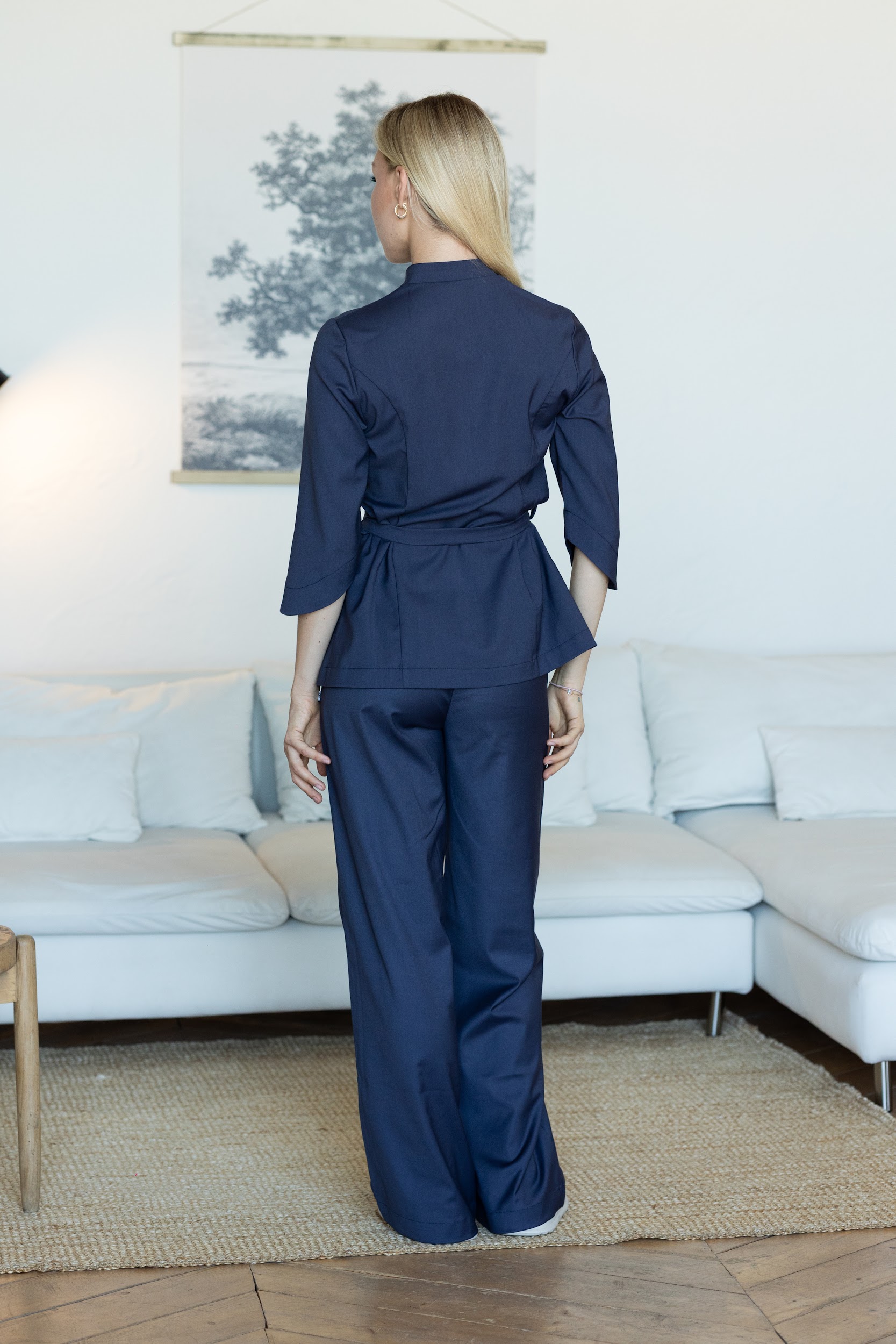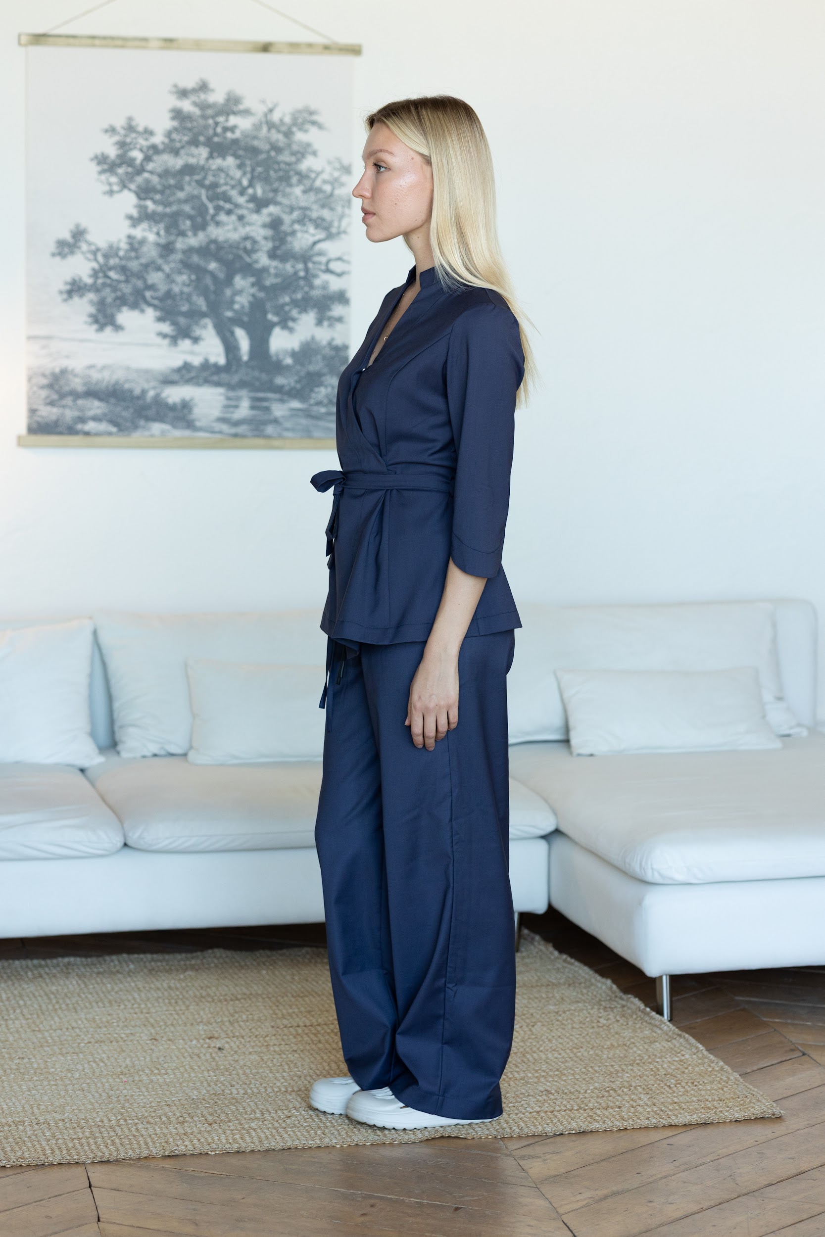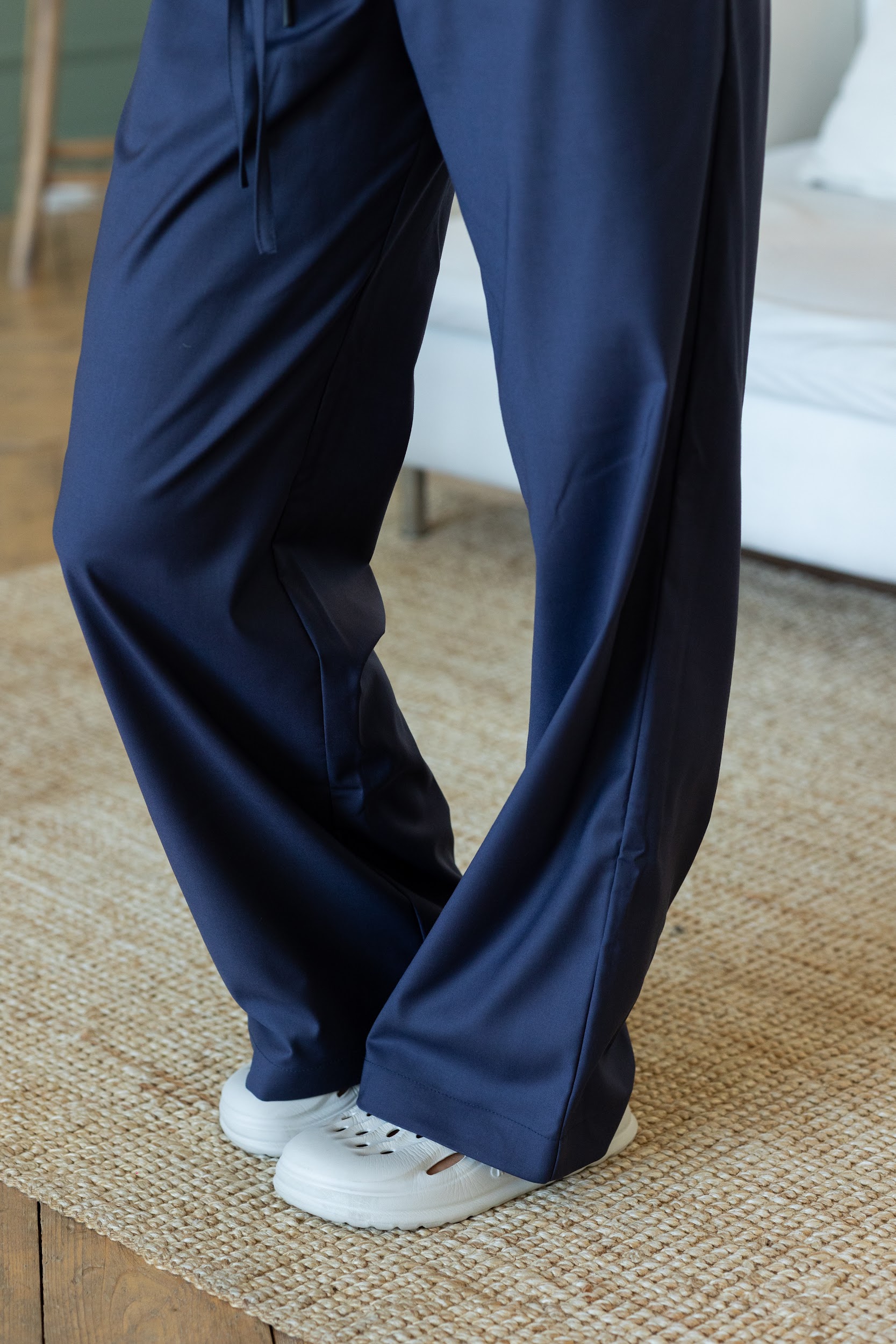 Брюки палаццо классического кроя: выполнены из легкой графитовой ткани, имеют свободные, широкие штанины по всей длине и высокую посадку на талии с удобной резинкой и шнурком для регулировки объема. Присутствуют боковые карманы, что делает модель не только стильной, но и практичной.