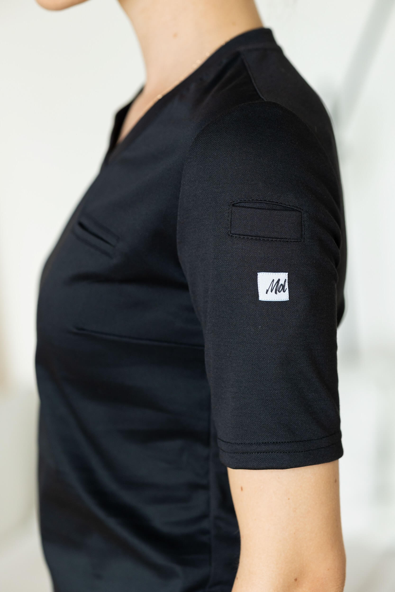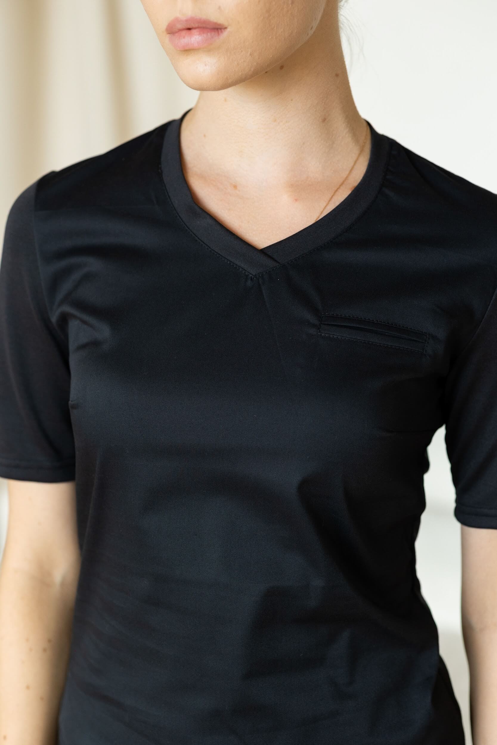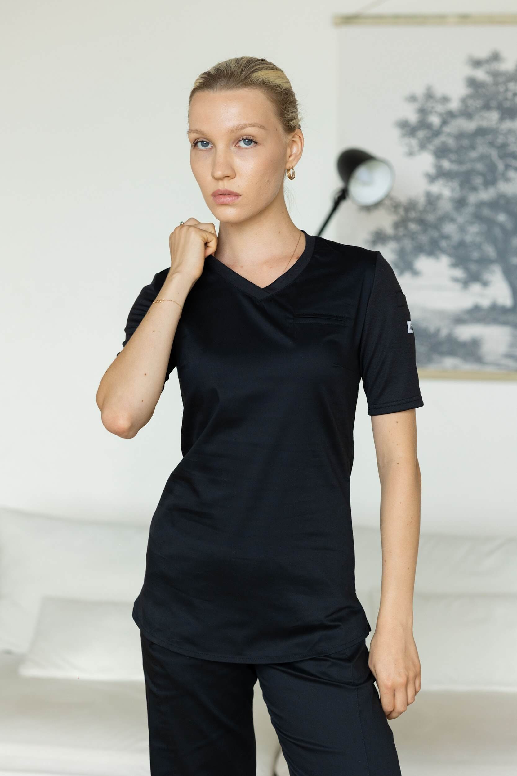 Чёрный цвет подчеркивает строгость и элегантность, легко комбинируется с любыми медицинскими брюками или юбками. Модель оснащена удобным нагрудным карманом для бейджа или мелких аксессуаров, быстро сохнет и долго сохраняет аккуратный вид — оптимальное решение для повседневной носки и любого корпоративного стиля.