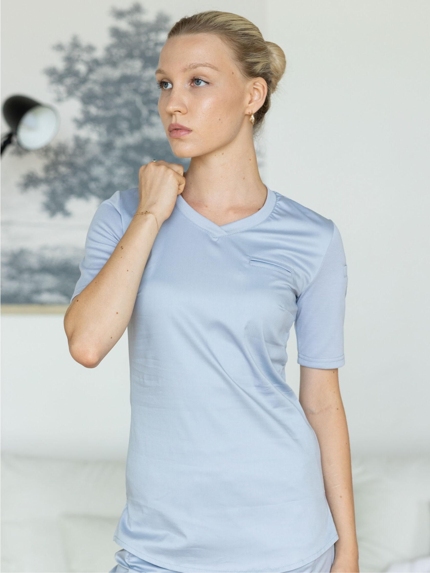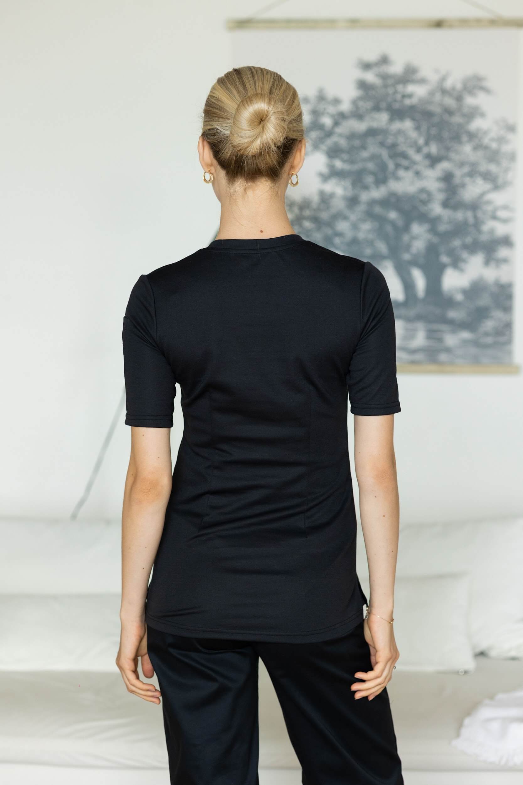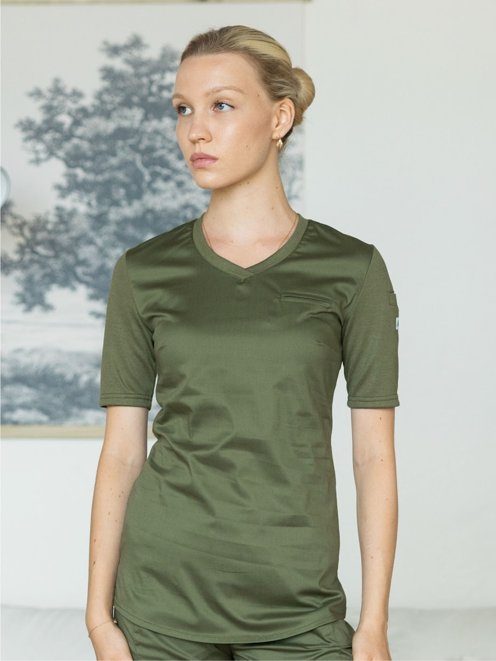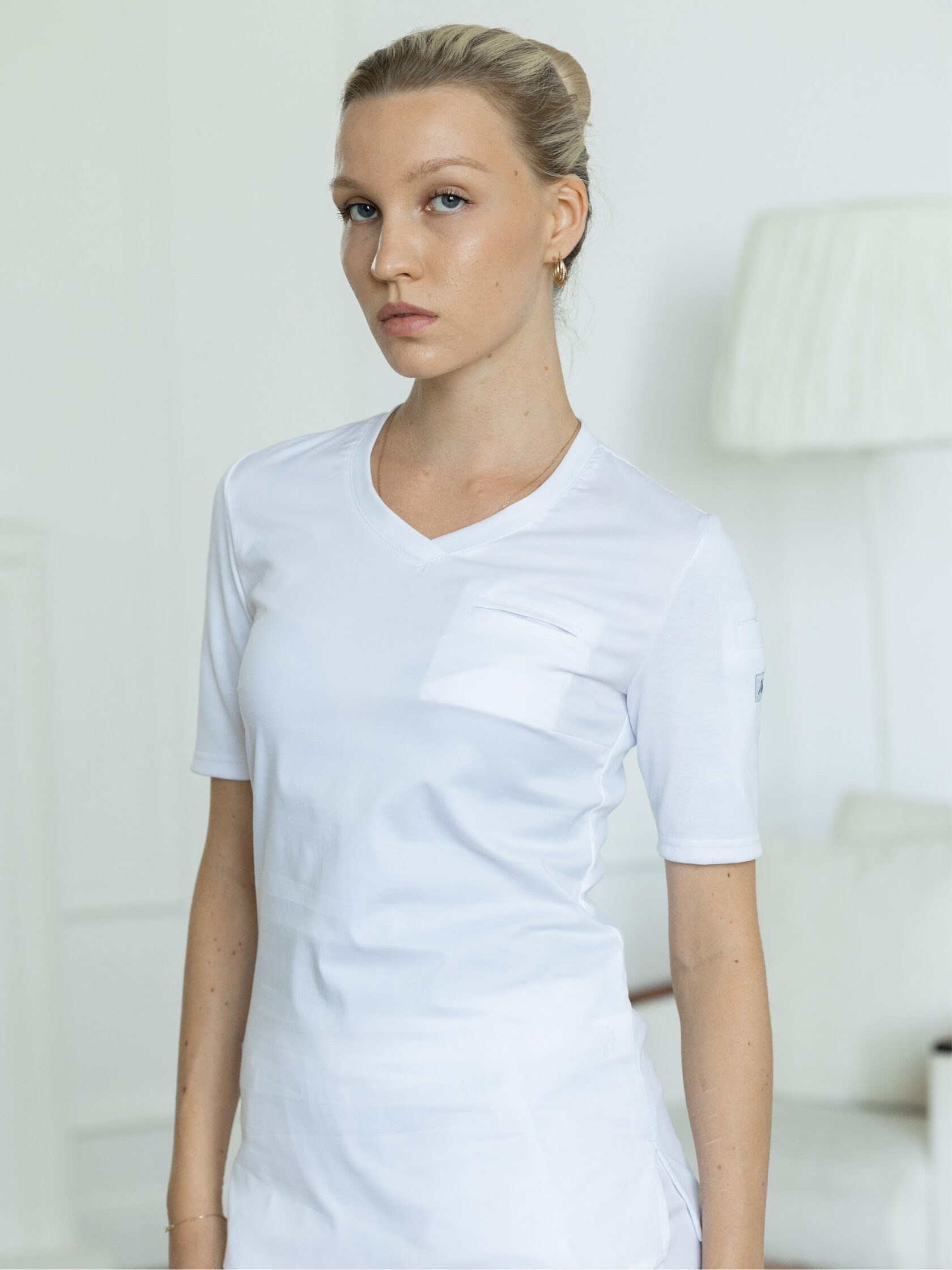 Чёрный цвет подчеркивает строгость и элегантность, легко комбинируется с любыми медицинскими брюками или юбками. Модель оснащена удобным нагрудным карманом для бейджа или мелких аксессуаров, быстро сохнет и долго сохраняет аккуратный вид — оптимальное решение для повседневной носки и любого корпоративного стиля.