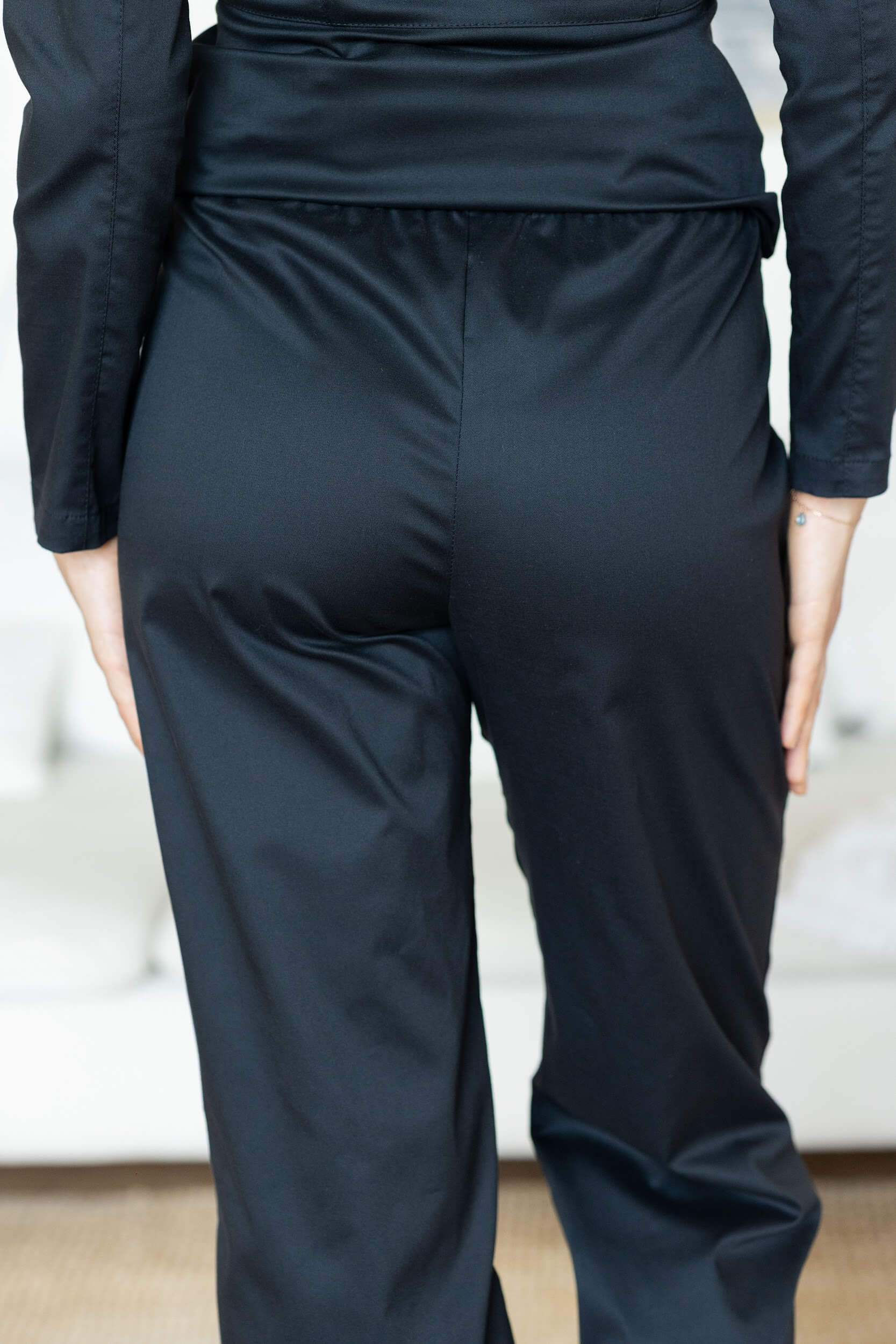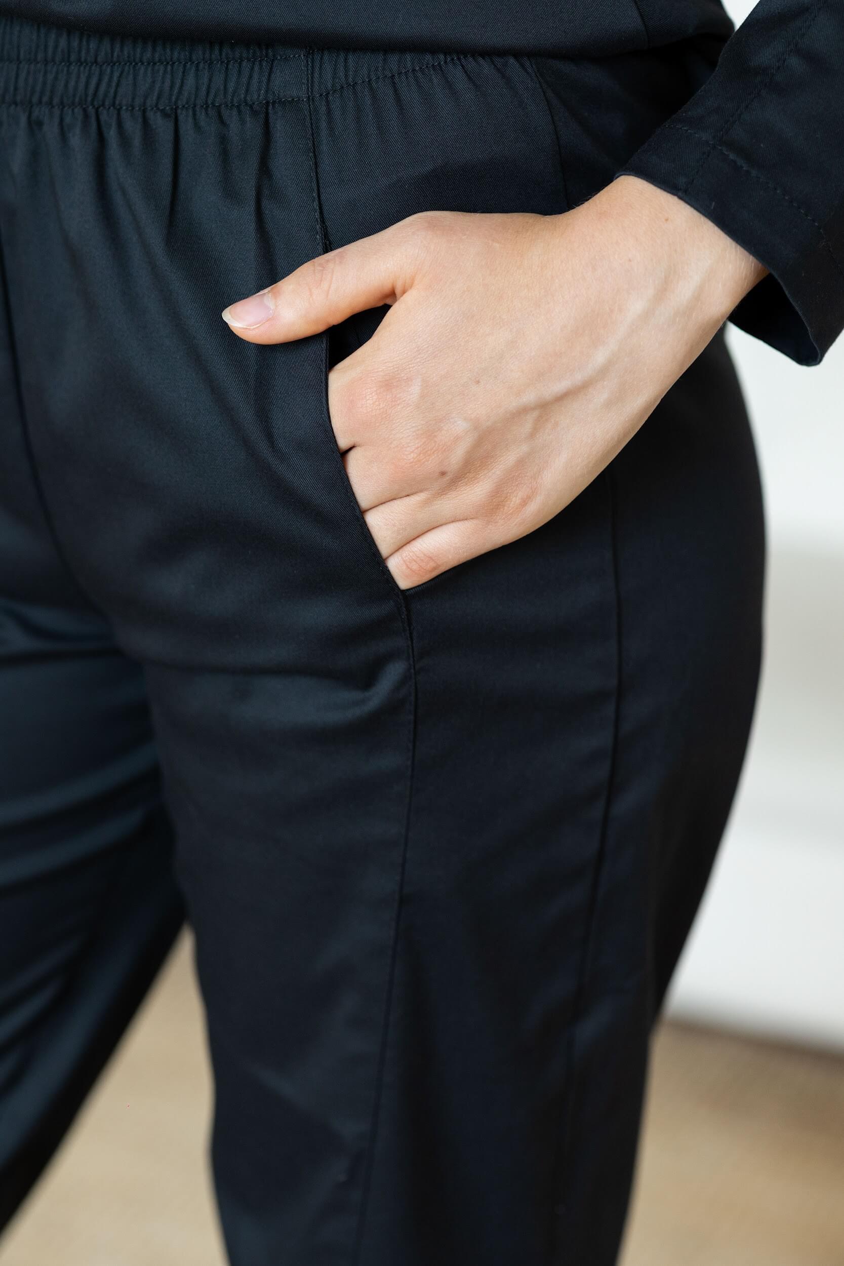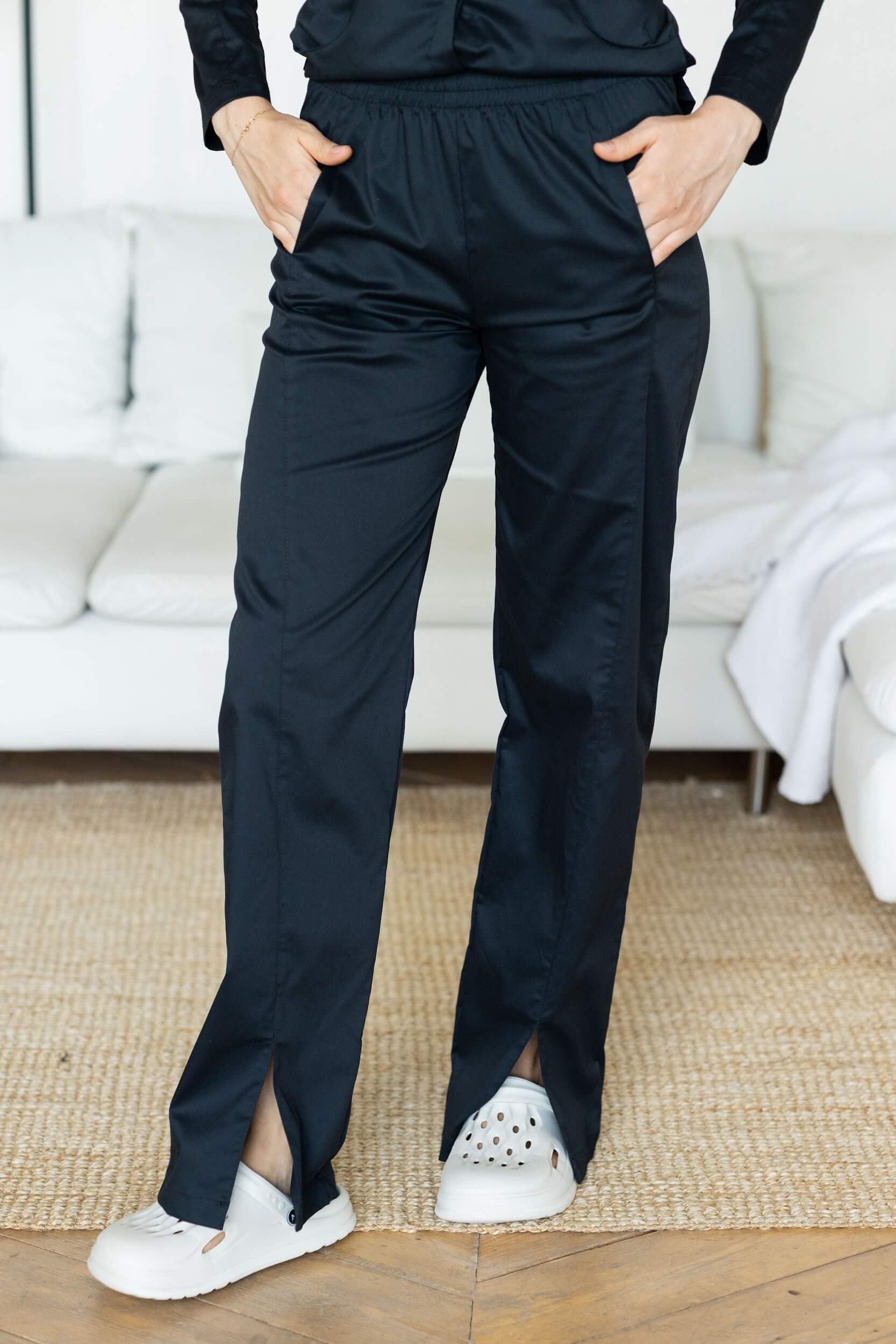 Медицинские брюки женские черные — универсальная модель для современного медицинского гардероба. Прямой силуэт и разрезы создают аккуратный и строгий образ, а комфортный пояс на резинке обеспечивает отличную посадку. Ткань устойчивa к износу, легко стирается и быстро сохнет, сохраняя насыщенный чёрный цвет даже после множества стирок.