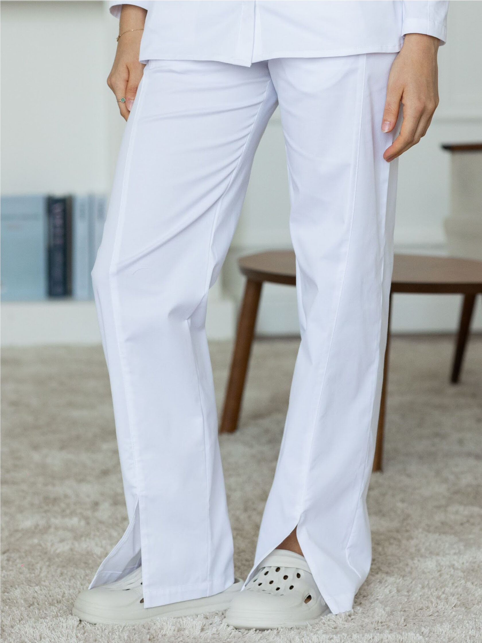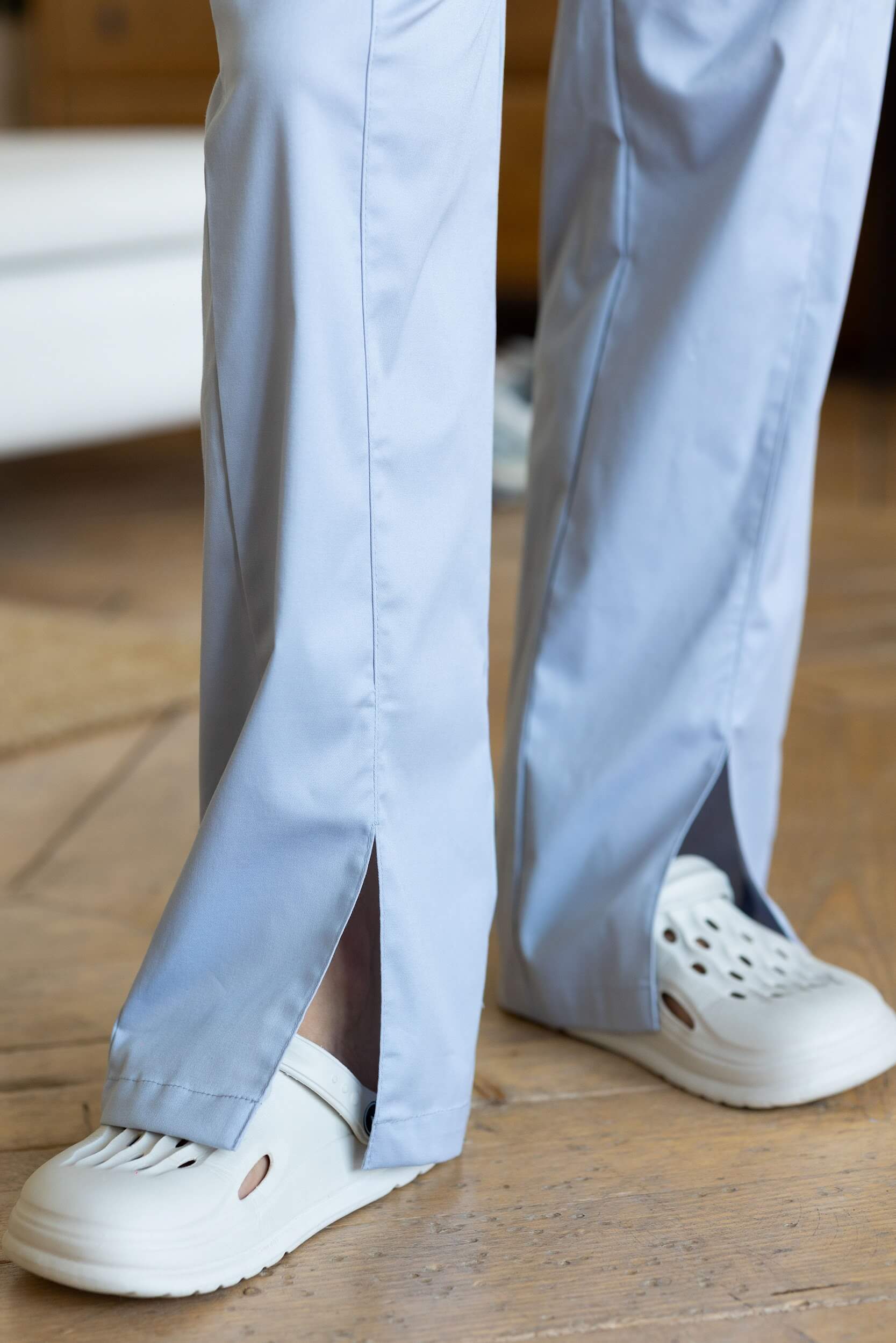 Медицинские брюки женские серо-голубые — отличный выбор для тех, кто ценит легкость и свежесть образа на работе. Прямой крой и аккуратные разрезы по низу брюк обеспечивают свободу движений и подчёркивают современный стиль. Ткань приятная к телу, хорошо пропускает воздух и проста в уходе — подходит для длительных смен.